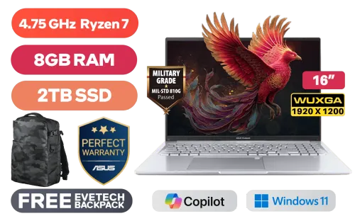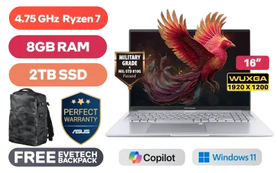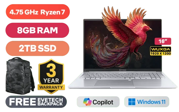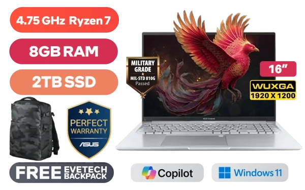 ASUS Vivobook 16 M1605NAQ AMD Ryzen 7 170 up to 4.75GHz Processor, 20MB Cache, 8x Cores, 16x Threads / 8GB DDR5 RAM / 2TB Ultra-Fast NVMe SSD / 16" WUXGA (1920x1200) Anti-Glare Display / Integrated AMD Radeon 680M Graphics / Windows 11 Home (64bit) / MediaTek Wi-Fi 6 MT7920 Wireless LAN / Bluetooth 5.4 / 720p HD Camera With Privacy Shutter / 3x USB 3.2 Type-A / 2x USB Type-C (Supports Power Delivery) / 1x HDMI / 1x Headphone and microphone Combo Jack / White Backlit Keyboard / SonicMaster Audio / ASUS Vivobook 16 M1605NAQ Ryzen 7 Laptop DealASUS Vivobook 16 M1605NAQ AMD Ryzen 7 170 up to 4.75GHz Processor, 20MB Cache, 8x Cores, 16x Threads / 8GB DDR5 RAM / 2TB Ultra-Fast NVMe SSD / 16" WUXGA (1920x1200) Anti-Glare Display / Integrated AMD Radeon 680M Graphics / Windows 11 Home (64bit) / MediaTek Wi-Fi 6 MT7920 Wireless LAN / Bluetooth 5.4 / 720p HD Camera With Privacy Shutter / 3x USB 3.2 Type-A / 2x USB Type-C (Supports Power Delivery) / 1x HDMI / 1x Headphone and microphone Combo Jack / White Backlit Keyboard / SonicMaster Audio / ASUS Vivobook 16 M1605NAQ Ryzen 7 Laptop Deal [M1605NAQ-78512S0W/2TB] / 3 YEARS WARRANTY / [+] GET FREE EVETECH DASH Premium Gaming Backpack+ FREE DELIVERY !