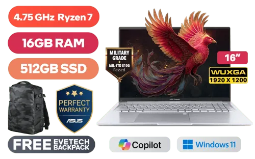 ASUS Vivobook 16 M1605NAQ AMD Ryzen 7 170 up to 4.75GHz Processor, 20MB Cache, 8x Cores, 16x Threads / 16GB DDR5 RAM / 512GB Ultra-Fast NVMe SSD / 16" WUXGA (1920x1200) Anti-Glare Display / Integrated AMD Radeon 680M Graphics / Windows 11 Home (64bit) / MediaTek Wi-Fi 6 MT7920 Wireless LAN / Bluetooth 5.4 / 720p HD Camera With Privacy Shutter / 3x USB 3.2 Type-A / 2x USB Type-C (Supports Power Delivery) / 1x HDMI / 1x Headphone and microphone Combo Jack / White Backlit Keyboard / SonicMaster Audio / ASUS Vivobook 16 M1605NAQ Ryzen 7 Laptop DealASUS Vivobook 16 M1605NAQ AMD Ryzen 7 170 up to 4.75GHz Processor, 20MB Cache, 8x Cores, 16x Threads / 16GB DDR5 RAM / 512GB Ultra-Fast NVMe SSD / 16" WUXGA (1920x1200) Anti-Glare Display / Integrated AMD Radeon 680M Graphics / Windows 11 Home (64bit) / MediaTek Wi-Fi 6 MT7920 Wireless LAN / Bluetooth 5.4 / 720p HD Camera With Privacy Shutter / 3x USB 3.2 Type-A / 2x USB Type-C (Supports Power Delivery) / 1x HDMI / 1x Headphone and microphone Combo Jack / White Backlit Keyboard / SonicMaster Audio / ASUS Vivobook 16 M1605NAQ Ryzen 7 Laptop Deal [M1605NAQ-78512S0W/16GB] / 3 YEARS WARRANTY / [+] GET FREE EVETECH DASH Premium Gaming Backpack+ FREE DELIVERY !
