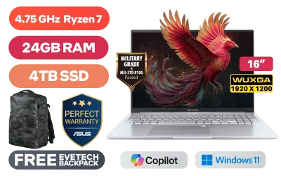 ASUS Vivobook 16 M1605NAQ AMD Ryzen 7 170 up to 4.75GHz Processor, 20MB Cache, 8x Cores, 16x Threads / 24GB DDR5 RAM / 4TB Ultra-Fast NVMe SSD / 16" WUXGA (1920x1200) Anti-Glare Display / Integrated AMD Radeon 680M Graphics / Windows 11 Home (64bit) / MediaTek Wi-Fi 6 MT7920 Wireless LAN / Bluetooth 5.4 / 720p HD Camera With Privacy Shutter / 3x USB 3.2 Type-A / 2x USB Type-C (Supports Power Delivery) / 1x HDMI / 1x Headphone and microphone Combo Jack / White Backlit Keyboard / SonicMaster Audio / ASUS Vivobook 16 M1605NAQ Ryzen 7 Laptop DealASUS Vivobook 16 M1605NAQ AMD Ryzen 7 170 up to 4.75GHz Processor, 20MB Cache, 8x Cores, 16x Threads / 24GB DDR5 RAM / 4TB Ultra-Fast NVMe SSD / 16" WUXGA (1920x1200) Anti-Glare Display / Integrated AMD Radeon 680M Graphics / Windows 11 Home (64bit) / MediaTek Wi-Fi 6 MT7920 Wireless LAN / Bluetooth 5.4 / 720p HD Camera With Privacy Shutter / 3x USB 3.2 Type-A / 2x USB Type-C (Supports Power Delivery) / 1x HDMI / 1x Headphone and microphone Combo Jack / White Backlit Keyboard / SonicMaster Audio / ASUS Vivobook 16 M1605NAQ Ryzen 7 Laptop Deal [M1605NAQ-78512S0W/24GB/4TB] / 3 YEARS WARRANTY / [+] GET FREE EVETECH DASH Premium Gaming Backpack+ FREE DELIVERY !