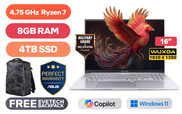 ASUS Vivobook 16 M1605NAQ AMD Ryzen 7 170 up to 4.75GHz Processor, 20MB Cache, 8x Cores, 16x Threads / 8GB DDR5 RAM / 4TB Ultra-Fast NVMe SSD / 16" WUXGA (1920x1200) Anti-Glare Display / Integrated AMD Radeon 680M Graphics / Windows 11 Home (64bit) / MediaTek Wi-Fi 6 MT7920 Wireless LAN / Bluetooth 5.4 / 720p HD Camera With Privacy Shutter / 3x USB 3.2 Type-A / 2x USB Type-C (Supports Power Delivery) / 1x HDMI / 1x Headphone and microphone Combo Jack / White Backlit Keyboard / SonicMaster Audio / ASUS Vivobook 16 M1605NAQ Ryzen 7 Laptop DealASUS Vivobook 16 M1605NAQ AMD Ryzen 7 170 up to 4.75GHz Processor, 20MB Cache, 8x Cores, 16x Threads / 8GB DDR5 RAM / 4TB Ultra-Fast NVMe SSD / 16" WUXGA (1920x1200) Anti-Glare Display / Integrated AMD Radeon 680M Graphics / Windows 11 Home (64bit) / MediaTek Wi-Fi 6 MT7920 Wireless LAN / Bluetooth 5.4 / 720p HD Camera With Privacy Shutter / 3x USB 3.2 Type-A / 2x USB Type-C (Supports Power Delivery) / 1x HDMI / 1x Headphone and microphone Combo Jack / White Backlit Keyboard / SonicMaster Audio / ASUS Vivobook 16 M1605NAQ Ryzen 7 Laptop Deal [M1605NAQ-78512S0W/4TB] / 3 YEARS WARRANTY / [+] GET FREE EVETECH DASH Premium Gaming Backpack+ FREE DELIVERY !
