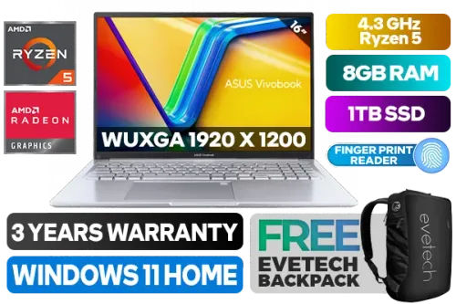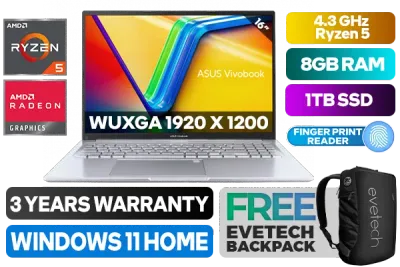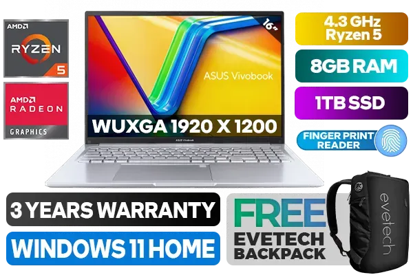 ASUS Vivobook 16 M1605YA AMD Ryzen 5 7430U up to 4.3GHz Processor with AMD Max Boost Clock Technology, 19MB Cache, 6x Cores, 12x Threads / 8GB DDR4 RAM / 1TB Ultra-Fast NVMe SSD / 16" WUXGA (1920 x 1200) Anti-glare Display / Integrated AMD Radeon™ Graphics / Windows 11 Home (64bit) / No DVD Writer Included / Wi-Fi 6E MediaTek MT7902 Wireless LAN / Bluetooth 5.1 / HD Web Camera With Privacy Shutter / 2x USB 3.2 Type-A / 1x USB 2.0 / 1x USB 3.2 Type-C / 1x HDMI / 1x Audio In And Out Combo Jack / White Backlit Chiclet Keyboard / Finger Print Reader / SonicMaster Audio / ASUS Vivobook 16 M1605YA Ryzen 5 Laptop DealASUS Vivobook 16 M1605YA AMD Ryzen 5 7430U up to 4.3GHz Processor with AMD Max Boost Clock Technology, 19MB Cache, 6x Cores, 12x Threads / 8GB DDR4 RAM / 1TB Ultra-Fast NVMe SSD / 16" WUXGA (1920 x 1200) Anti-glare Display / Integrated AMD Radeon™ Graphics / Windows 11 Home (64bit) / No DVD Writer Included / Wi-Fi 6E MediaTek MT7902 Wireless LAN / Bluetooth 5.1 / HD Web Camera With Privacy Shutter / 2x USB 3.2 Type-A / 1x USB 2.0 / 1x USB 3.2 Type-C / 1x HDMI / 1x Audio In And Out Combo Jack / White Backlit Chiclet Keyboard / Finger Print Reader / SonicMaster Audio / ASUS Vivobook 16 M1605YA Ryzen 5 Laptop Deal [M1605YA-5810S0W] / 3 YEARS WARRANTY / [+] GET FREE EVETECH NEO Premium Gaming Backpack+ FREE DELIVERY !