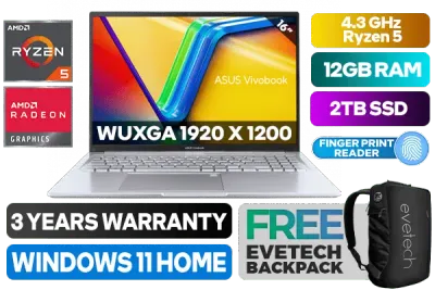 ASUS Vivobook 16 M1605YA AMD Ryzen 5 7430U up to 4.3GHz Processor with AMD Max Boost Clock Technology, 19MB Cache, 6x Cores, 12x Threads / 12GB DDR4 RAM / 2TB Ultra-Fast NVMe SSD / 16" WUXGA (1920 x 1200) Anti-glare Display / Integrated AMD Radeon™ Graphics / Windows 11 Home (64bit) / No DVD Writer Included / Wi-Fi 6E MediaTek MT7902 Wireless LAN / Bluetooth 5.1 / HD Web Camera With Privacy Shutter / 2x USB 3.2 Type-A / 1x USB 2.0 / 1x USB 3.2 Type-C / 1x HDMI / 1x Audio In And Out Combo Jack / White Backlit Chiclet Keyboard / Finger Print Reader / SonicMaster Audio / ASUS Vivobook 16 M1605YA Ryzen 5 Laptop DealASUS Vivobook 16 M1605YA AMD Ryzen 5 7430U up to 4.3GHz Processor with AMD Max Boost Clock Technology, 19MB Cache, 6x Cores, 12x Threads / 12GB DDR4 RAM / 2TB Ultra-Fast NVMe SSD / 16" WUXGA (1920 x 1200) Anti-glare Display / Integrated AMD Radeon™ Graphics / Windows 11 Home (64bit) / No DVD Writer Included / Wi-Fi 6E MediaTek MT7902 Wireless LAN / Bluetooth 5.1 / HD Web Camera With Privacy Shutter / 2x USB 3.2 Type-A / 1x USB 2.0 / 1x USB 3.2 Type-C / 1x HDMI / 1x Audio In And Out Combo Jack / White Backlit Chiclet Keyboard / Finger Print Reader / SonicMaster Audio / ASUS Vivobook 16 M1605YA Ryzen 5 Laptop Deal [M1605YA-5810S0W/12GB/2TB] / 3 YEARS WARRANTY / [+] GET FREE EVETECH NEO Premium Gaming Backpack+ FREE DELIVERY !
