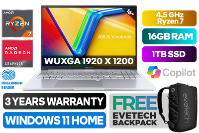 ASUS Vivobook 16 M1605YA AMD Ryzen 7 7730U up to 4.5GHz Processor with AMD Max Boost Clock Technology, 20MB Cache, 8x Cores, 16x Threads / 16GB DDR4 RAM / 1TB Ultra-Fast NVMe SSD / 16" WUXGA (1920 x 1200) Anti-glare Display / Integrated AMD Radeon™ Graphics / Windows 11 Home (64bit) / No DVD Writer Included / Wi-Fi 6 MediaTek MT7902 Wireless LAN / Bluetooth 5.1 / HD Web Camera With Privacy Shutter / 2x USB 3.2 Type-A / 1x USB 2.0 / 1x USB 3.2 Type-C / 1x HDMI / 1x Audio In And Out Combo Jack / White Backlit Chiclet Keyboard / Finger Print Reader / SonicMaster Audio / ASUS Vivobook 16 M1605YA Ryzen 7 Laptop DealASUS Vivobook 16 M1605YA AMD Ryzen 7 7730U up to 4.5GHz Processor with AMD Max Boost Clock Technology, 20MB Cache, 8x Cores, 16x Threads / 16GB DDR4 RAM / 1TB Ultra-Fast NVMe SSD / 16" WUXGA (1920 x 1200) Anti-glare Display / Integrated AMD Radeon™ Graphics / Windows 11 Home (64bit) / No DVD Writer Included / Wi-Fi 6 MediaTek MT7902 Wireless LAN / Bluetooth 5.1 / HD Web Camera With Privacy Shutter / 2x USB 3.2 Type-A / 1x USB 2.0 / 1x USB 3.2 Type-C / 1x HDMI / 1x Audio In And Out Combo Jack / White Backlit Chiclet Keyboard / Finger Print Reader / SonicMaster Audio / ASUS Vivobook 16 M1605YA Ryzen 7 Laptop Deal [M1605YA-7810S0W/16GB] / [+] GET FREE EVETECH NEO Premium Gaming Backpack / 3 YEARS WARRANTY + FREE DELIVERY !
