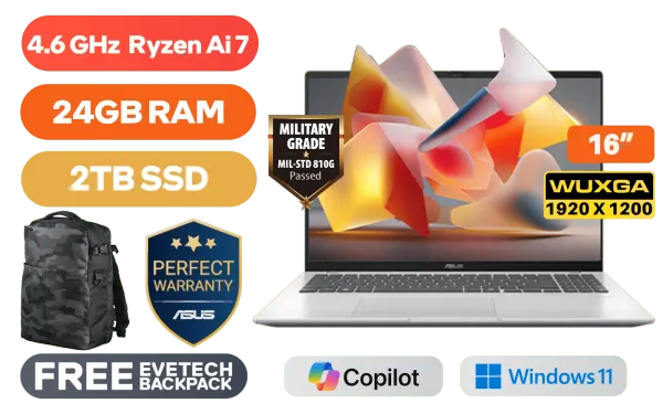ASUS Vivobook 16 M1607GA AMD Ryzen™ AI 7-445 up to 4.6GHz Processor, 14MB Cache, 6x Cores, 12x Threads / 24GB DDR5 RAM / 2TB Ultra-Fast NVMe SSD / 16" WUXGA (1920x1200) IPS-Level Display / Integrated Radeon Graphics / Windows 11 Home (64bit) / MediaTek WiFi 6 MT7920 Wireless LAN / Bluetooth 5.4 / FHD IR Camera with Privacy Shutter / 2 x USB Type-A / 2x USB Type-C (Supports DisplayPort / Power Delviery) / 1 x HDMI / 1x Microphone & Headphone Combo jack / White Backlit Keyboard / SonicMaster Audio / ASUS Vivobook 16 M1607GA Ryzen AI 7 Laptop DealASUS Vivobook 16 M1607GA AMD Ryzen™ AI 7-445 up to 4.6GHz Processor, 14MB Cache, 6x Cores, 12x Threads / 24GB DDR5 RAM / 2TB Ultra-Fast NVMe SSD / 16" WUXGA (1920x1200) IPS-Level Display / Integrated Radeon Graphics / Windows 11 Home (64bit) / MediaTek WiFi 6 MT7920 Wireless LAN / Bluetooth 5.4 / FHD IR Camera with Privacy Shutter / 2 x USB Type-A / 2x USB Type-C (Supports DisplayPort / Power Delviery) / 1 x HDMI / 1x Microphone & Headphone Combo jack / White Backlit Keyboard / SonicMaster Audio / ASUS Vivobook 16 M1607GA Ryzen AI 7 Laptop Deal [M1607GA-716512S0W/24GB/2TB] / 3 YEARS WARRANTY / [+] GET FREE EVETECH DASH Premium Gaming Backpack+ FREE DELIVERY !