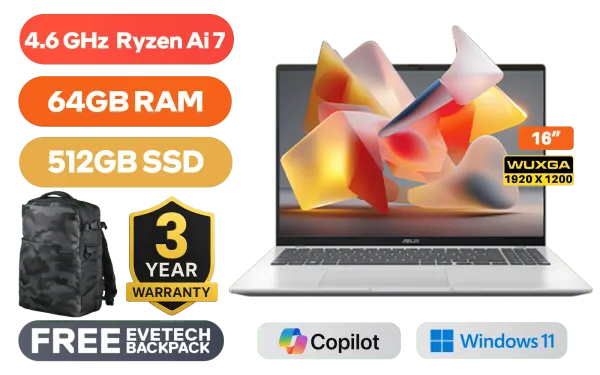 ASUS Vivobook 16 M1607GA AMD Ryzen™ AI 7-445 up to 4.6GHz Processor, 14MB Cache, 6x Cores, 12x Threads / 64GB DDR5 RAM / 512GB Ultra-Fast NVMe SSD / 16" WUXGA (1920x1200) IPS-Level Display / Integrated Radeon Graphics / Windows 11 Home (64bit) / MediaTek WiFi 6 MT7920 Wireless LAN / Bluetooth 5.4 / FHD IR Camera with Privacy Shutter / 2 x USB Type-A / 2x USB Type-C (Supports DisplayPort / Power Delviery) / 1 x HDMI / 1x Microphone & Headphone Combo jack / White Backlit Keyboard / SonicMaster Audio / ASUS Vivobook 16 M1607GA Ryzen AI 7 Laptop DealASUS Vivobook 16 M1607GA AMD Ryzen™ AI 7-445 up to 4.6GHz Processor, 14MB Cache, 6x Cores, 12x Threads / 64GB DDR5 RAM / 512GB Ultra-Fast NVMe SSD / 16" WUXGA (1920x1200) IPS-Level Display / Integrated Radeon Graphics / Windows 11 Home (64bit) / MediaTek WiFi 6 MT7920 Wireless LAN / Bluetooth 5.4 / FHD IR Camera with Privacy Shutter / 2 x USB Type-A / 2x USB Type-C (Supports DisplayPort / Power Delviery) / 1 x HDMI / 1x Microphone & Headphone Combo jack / White Backlit Keyboard / SonicMaster Audio / ASUS Vivobook 16 M1607GA Ryzen AI 7 Laptop Deal [M1607GA-716512S0W/64GB] / 3 YEARS WARRANTY / [+] GET FREE EVETECH DASH Premium Gaming Backpack+ FREE DELIVERY !