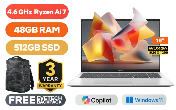 ASUS Vivobook 16 M1607GA AMD Ryzen™ AI 7-445 up to 4.6GHz Processor, 14MB Cache, 6x Cores, 12x Threads / 48GB DDR5 RAM / 512GB Ultra-Fast NVMe SSD / 16" WUXGA (1920x1200) IPS-Level Display / Integrated Radeon Graphics / Windows 11 Home (64bit) / MediaTek WiFi 6 MT7920 Wireless LAN / Bluetooth 5.4 / FHD IR Camera with Privacy Shutter / 2 x USB Type-A / 2x USB Type-C (Supports DisplayPort / Power Delviery) / 1 x HDMI / 1x Microphone & Headphone Combo jack / White Backlit Keyboard / SonicMaster Audio / ASUS Vivobook 16 M1607GA Ryzen AI 7 Laptop DealASUS Vivobook 16 M1607GA AMD Ryzen™ AI 7-445 up to 4.6GHz Processor, 14MB Cache, 6x Cores, 12x Threads / 48GB DDR5 RAM / 512GB Ultra-Fast NVMe SSD / 16" WUXGA (1920x1200) IPS-Level Display / Integrated Radeon Graphics / Windows 11 Home (64bit) / MediaTek WiFi 6 MT7920 Wireless LAN / Bluetooth 5.4 / FHD IR Camera with Privacy Shutter / 2 x USB Type-A / 2x USB Type-C (Supports DisplayPort / Power Delviery) / 1 x HDMI / 1x Microphone & Headphone Combo jack / White Backlit Keyboard / SonicMaster Audio / ASUS Vivobook 16 M1607GA Ryzen AI 7 Laptop Deal [M1607GA-716512S0W/48GB] / 3 YEARS WARRANTY / [+] GET FREE EVETECH DASH Premium Gaming Backpack+ FREE DELIVERY !