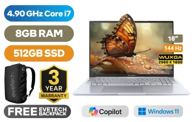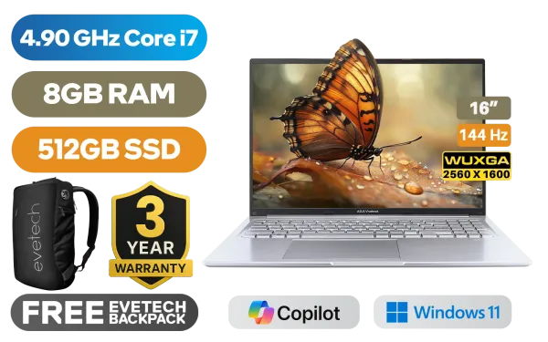 ASUS Vivobook 16 X1605VA 13th Gen Intel® Core™ i7-13620H up to 4.90GHz Processor, 24MB Cache, 10x Cores, 16x Threads / 8GB DDR4 RAM / 512GB Ultra-Fast NVMe SSD / 16" WQXGA (2560 x 1600) 144Hz, IPS-Level Display / Integrated Intel UHD Graphics / Windows 11 Home (64bit) / MediaTek Wi-Fi 6E MT7902 Wireless LAN / Bluetooth 5.3 / 720p HD camera With privacy shutter / 3 x USB Type-A / 1x USB Type-C (Supports Power Delivery) / 1 x HDMI / 1x Microphone and Headphone Combo jack / SonicMaster Audio / ASUS Vivobook 16 X1605VA Core i7 Laptop DealASUS Vivobook 16 X1605VA 13th Gen Intel® Core™ i7-13620H up to 4.90GHz Processor, 24MB Cache, 10x Cores, 16x Threads / 8GB DDR4 RAM / 512GB Ultra-Fast NVMe SSD / 16" WQXGA (2560 x 1600) 144Hz, IPS-Level Display / Integrated Intel UHD Graphics / Windows 11 Home (64bit) / MediaTek Wi-Fi 6E MT7902 Wireless LAN / Bluetooth 5.3 / 720p HD camera With privacy shutter / 3 x USB Type-A / 1x USB Type-C (Supports Power Delivery) / 1 x HDMI / 1x Microphone and Headphone Combo jack / SonicMaster Audio / ASUS Vivobook 16 X1605VA Core i7 Laptop Deal [X1605VA-I78512S0W] / [+] GET FREE EVETECH NEO Premium Gaming Backpack / 3 YEARS WARRANTY / [+] GET FREE Logitech M185 Wireless Mouse+ FREE DELIVERY !