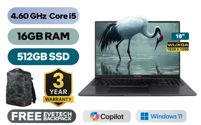 ASUS Vivobook 16 X1605VA Intel® Core™ i5-13420H up to 4.60GHz Processor, 12MB Cache, 8x Cores, 12x Threads / 16GB DDR4 RAM / 512GB Ultra-Fast NVMe SSD / 16" WUXGA (1920 x 1200) Anti-glare Display / Integrated Intel UHD Graphics / Windows 11 Home (64bit) / 720p HD camera With privacy shutter / MediaTek Wi-Fi 6E MT7902 Wireless LAN / Bluetooth 5.3 / 3 x USB Type-A / 1x USB Type-C / 1 x HDMI / 1x Microphone and Headphone Combo jack / White Backlit Keyboard / SonicMaster Audio / ASUS Vivobook 16 X1605VA Core i5 Laptop DealASUS Vivobook 16 X1605VA Intel® Core™ i5-13420H up to 4.60GHz Processor, 12MB Cache, 8x Cores, 12x Threads / 16GB DDR4 RAM / 512GB Ultra-Fast NVMe SSD / 16" WUXGA (1920 x 1200) Anti-glare Display / Integrated Intel UHD Graphics / Windows 11 Home (64bit) / 720p HD camera With privacy shutter / MediaTek Wi-Fi 6E MT7902 Wireless LAN / Bluetooth 5.3 / 3 x USB Type-A / 1x USB Type-C / 1 x HDMI / 1x Microphone and Headphone Combo jack / White Backlit Keyboard / SonicMaster Audio / ASUS Vivobook 16 X1605VA Core i5 Laptop Deal [X1605VA-I58512B1W/16GB] / 3 YEARS WARRANTY / [+] GET FREE EVETECH DASH Premium Gaming Backpack+ FREE DELIVERY !