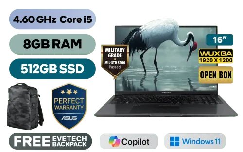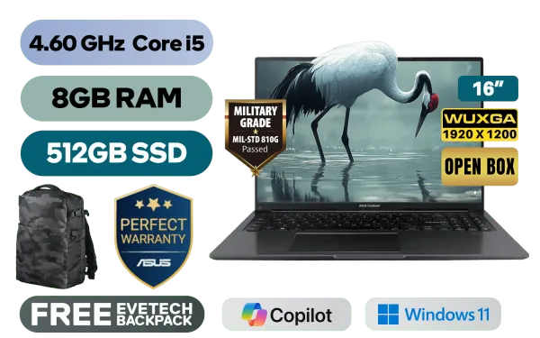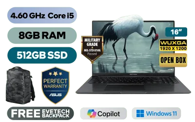 [OPEN BOX] ASUS Vivobook 16 X1605VA Intel® Core⢠i5-13420H up to 4.60GHz Processor, 12MB Cache, 8x Cores, 12x Threads / 8GB DDR4 RAM / 512GB Ultra-Fast NVMe SSD / 16" WUXGA (1920 x 1200) Anti-glare Display / Integrated Intel UHD Graphics / Windows 11 Home (64bit) / 720p HD camera With privacy shutter / MediaTek Wi-Fi 6E MT7902 Wireless LAN / Bluetooth 5.3 / 3 x USB Type-A / 1x USB Type-C / 1 x HDMI / 1x Microphone and Headphone Combo jack / White Backlit Keyboard / SonicMaster Audio / 1 Year Warranty / ASUS Vivobook 16 X1605VA Core i5 Laptop Deal[OPEN BOX] ASUS Vivobook 16 X1605VA Intel® Core⢠i5-13420H up to 4.60GHz Processor, 12MB Cache, 8x Cores, 12x Threads / 8GB DDR4 RAM / 512GB Ultra-Fast NVMe SSD / 16" WUXGA (1920 x 1200) Anti-glare Display / Integrated Intel UHD Graphics / Windows 11 Home (64bit) / 720p HD camera With privacy shutter / MediaTek Wi-Fi 6E MT7902 Wireless LAN / Bluetooth 5.3 / 3 x USB Type-A / 1x USB Type-C / 1 x HDMI / 1x Microphone and Headphone Combo jack / White Backlit Keyboard / SonicMaster Audio / 1 Year Warranty / ASUS Vivobook 16 X1605VA Core i5 Laptop Deal [X1605VA-I58512B1W] / [+] GET FREE EVETECH DASH Premium Gaming Backpack+ FREE DELIVERY !