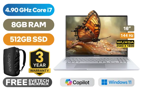 ASUS Vivobook 16 X1605VA 13th Gen Intel® Core™ i7-13620H up to 4.90GHz Processor, 24MB Cache, 10x Cores, 16x Threads / 8GB DDR4 RAM / 512GB Ultra-Fast NVMe SSD / 16" WQXGA (2560 x 1600) 144Hz, IPS-Level Display / Integrated Intel UHD Graphics / Windows 11 Home (64bit) / MediaTek Wi-Fi 6E MT7902 Wireless LAN / Bluetooth 5.3 / 720p HD camera With privacy shutter / 3 x USB Type-A / 1x USB Type-C (Supports Power Delivery) / 1 x HDMI / 1x Microphone and Headphone Combo jack / SonicMaster Audio / ASUS Vivobook 16 X1605VA Core i7 Laptop DealASUS Vivobook 16 X1605VA 13th Gen Intel® Core™ i7-13620H up to 4.90GHz Processor, 24MB Cache, 10x Cores, 16x Threads / 8GB DDR4 RAM / 512GB Ultra-Fast NVMe SSD / 16" WQXGA (2560 x 1600) 144Hz, IPS-Level Display / Integrated Intel UHD Graphics / Windows 11 Home (64bit) / MediaTek Wi-Fi 6E MT7902 Wireless LAN / Bluetooth 5.3 / 720p HD camera With privacy shutter / 3 x USB Type-A / 1x USB Type-C (Supports Power Delivery) / 1 x HDMI / 1x Microphone and Headphone Combo jack / SonicMaster Audio / ASUS Vivobook 16 X1605VA Core i7 Laptop Deal [X1605VA-I78512S0W] / [+] GET FREE EVETECH NEO Premium Gaming Backpack / 3 YEARS WARRANTY / [+] GET FREE Logitech M185 Wireless Mouse+ FREE DELIVERY !