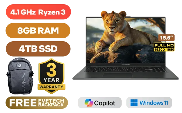 ASUS Vivobook Go E1504FA AMD Ryzen 3 7320U up to 4.1GHz processor, 6MB cache, 4x core, 8x thread / 8GB LPDDR5 RAM / 4TB Ultra-Fast NVMe SSD / 15.6" FHD (1920 x 1080) Anti-Glare Display / Integrated AMD Radeon Graphics / Windows 11 Home(64bit) / MediaTek Wi-Fi 6E MT7902 Wireless LAN / Bluetooth 5.3 / 720p HD camera with Privacy Shutter / 2x USB Type-A / 1x USB Type-C / 1x HDMI / 1x Microphone and Headphone Combo jack / Built-in Speakers and Microphone with SonicMaster Audio / ASUS Vivobook Go E1504FA Ryzen 3 Laptop DealASUS Vivobook Go E1504FA AMD Ryzen 3 7320U up to 4.1GHz processor, 6MB cache, 4x core, 8x thread / 8GB LPDDR5 RAM / 4TB Ultra-Fast NVMe SSD / 15.6" FHD (1920 x 1080) Anti-Glare Display / Integrated AMD Radeon Graphics / Windows 11 Home(64bit) / MediaTek Wi-Fi 6E MT7902 Wireless LAN / Bluetooth 5.3 / 720p HD camera with Privacy Shutter / 2x USB Type-A / 1x USB Type-C / 1x HDMI / 1x Microphone and Headphone Combo jack / Built-in Speakers and Microphone with SonicMaster Audio / ASUS Vivobook Go E1504FA Ryzen 3 Laptop Deal [E1504FA-38512B0W/4TB] / [+] GET FREE EVETECH FLUX Premium Gaming Backpack / [+] GET FREE Logitech M185 Wireless Mouse+ FREE DELIVERY !