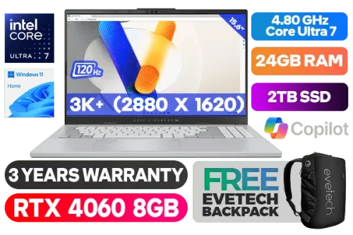 ASUS Vivobook Pro 15 OLED N6506MV Intel Core Ultra 7-155H up to 4.80GHz Processor, 24MB Cache, 16x Cores, 22x Threads / 24GB DDR5 RAM / 2TB Ultra-Fast NVMe SSD / 15.6" 3K+ (2880 x 1620) 120Hz, Glossy Display / NVIDIA GeForce RTX 4060 8GB GDDR6 Dedicated Graphics / Windows 11 Home (64bit) / White Backlit Keyboard / Bluetooth v5.3 / Intel Wi-Fi 6E Wireless LAN / 5.0M Camera With Privacy Shutter / 2 x USB 3.2 Type-A / 2 x USB 3.2 Type C / 1 x HDMI / 1x Microphone and Headphone Combo jack / 1 x RJ45 / 1x SD Card Reader / ASUS Vivobook Pro 15 OLED Core Ultra 7 RTX 4060 Laptop DealASUS Vivobook Pro 15 OLED N6506MV Intel Core Ultra 7-155H up to 4.80GHz Processor, 24MB Cache, 16x Cores, 22x Threads / 24GB DDR5 RAM / 2TB Ultra-Fast NVMe SSD / 15.6" 3K+ (2880 x 1620) 120Hz, Glossy Display / NVIDIA GeForce RTX 4060 8GB GDDR6 Dedicated Graphics / Windows 11 Home (64bit) / White Backlit Keyboard / Bluetooth v5.3 / Intel Wi-Fi 6E Wireless LAN / 5.0M Camera With Privacy Shutter / 2 x USB 3.2 Type-A / 2 x USB 3.2 Type C / 1 x HDMI / 1x Microphone and Headphone Combo jack / 1 x RJ45 / 1x SD Card Reader / ASUS Vivobook Pro 15 OLED Core Ultra 7 RTX 4060 Laptop Deal [N6506MV-OU71610S0W/24GB/2TB] / 3 YEARS WARRANTY / [+] GET FREE EVETECH NEO Premium Gaming Backpack+ FREE DELIVERY !