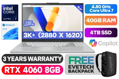 ASUS Vivobook Pro 15 OLED N6506MV Intel Core Ultra 7-155H up to 4.80GHz Processor, 24MB Cache, 16x Cores, 22x Threads / 40GB DDR5 RAM / 4TB Ultra-Fast NVMe SSD / 15.6" 3K+ (2880 x 1620) 120Hz, Glossy Display / NVIDIA GeForce RTX 4060 8GB GDDR6 Dedicated Graphics / Windows 11 Home (64bit) / White Backlit Keyboard / Bluetooth v5.3 / Intel Wi-Fi 6E Wireless LAN / 5.0M Camera With Privacy Shutter / 2 x USB 3.2 Type-A / 2 x USB 3.2 Type C / 1 x HDMI / 1x Microphone and Headphone Combo jack / 1 x RJ45 / 1x SD Card Reader / ASUS Vivobook Pro 15 OLED Core Ultra 7 RTX 4060 Laptop DealASUS Vivobook Pro 15 OLED N6506MV Intel Core Ultra 7-155H up to 4.80GHz Processor, 24MB Cache, 16x Cores, 22x Threads / 40GB DDR5 RAM / 4TB Ultra-Fast NVMe SSD / 15.6" 3K+ (2880 x 1620) 120Hz, Glossy Display / NVIDIA GeForce RTX 4060 8GB GDDR6 Dedicated Graphics / Windows 11 Home (64bit) / White Backlit Keyboard / Bluetooth v5.3 / Intel Wi-Fi 6E Wireless LAN / 5.0M Camera With Privacy Shutter / 2 x USB 3.2 Type-A / 2 x USB 3.2 Type C / 1 x HDMI / 1x Microphone and Headphone Combo jack / 1 x RJ45 / 1x SD Card Reader / ASUS Vivobook Pro 15 OLED Core Ultra 7 RTX 4060 Laptop Deal [N6506MV-OU71610S0W/40GB/4TB] / 3 YEARS WARRANTY / [+] GET FREE EVETECH NEO Premium Gaming Backpack+ FREE DELIVERY !