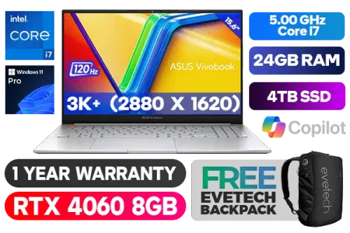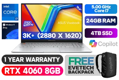 ASUS Vivobook Pro 15 OLED K6502VV Intel Core i7-13700H up to 5.00GHz Processor with Intel Turbo Boost Technology, 24MB Cache, 14x Cores, 20x Threads / 24GB DDR5 RAM / 4TB Ultra-Fast NVMe SSD / 15.6" 3K+ (2880 x 1620) 120Hz, Glossy Display / NVIDIA GeForce RTX 4060 8GB GDDR6 Dedicated Graphics / <span style="font-size: 20px; color: #00BFFF; font-weight: bold;">Windows 11 Professional (64bit)</span> / Bluetooth 5.3 / Intel Wi-Fi 6E Wireless LAN / 1080p FHD Camera With Privacy Shutter / 2 x USB 3.2 Type-A / 2 x USB 3.2 Type C / 1 x HDMI / 1x Microphone and Headphone Combo jack / 1x RJ45 / 1x SD card reader / Fingerprint Reader / White Backlit Keyboard / 1 Year Warranty / ASUS Vivobook Pro 15 OLED Intel Core i7 RTX 4060 Professional Laptop DealASUS Vivobook Pro 15 OLED K6502VV Intel Core i7-13700H up to 5.00GHz Processor with Intel Turbo Boost Technology, 24MB Cache, 14x Cores, 20x Threads / 24GB DDR5 RAM / 4TB Ultra-Fast NVMe SSD / 15.6" 3K+ (2880 x 1620) 120Hz, Glossy Display / NVIDIA GeForce RTX 4060 8GB GDDR6 Dedicated Graphics / Windows 11 Professional (64bit) / Bluetooth 5.3 / Intel Wi-Fi 6E Wireless LAN / 1080p FHD Camera With Privacy Shutter / 2 x USB 3.2 Type-A / 2 x USB 3.2 Type C / 1 x HDMI / 1x Microphone and Headphone Combo jack / 1x RJ45 / 1x SD card reader / Fingerprint Reader / White Backlit Keyboard / 1 Year Warranty / ASUS Vivobook Pro 15 OLED Intel Core i7 RTX 4060 Professional Laptop Deal [K6502VV-OI71610S0X/24GB/4TB] / [+] GET FREE EVETECH NEO Premium Gaming Backpack+ FREE DELIVERY !