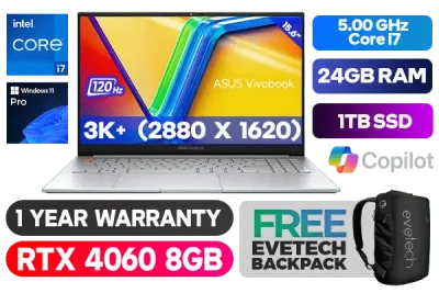 ASUS Vivobook Pro 15 OLED K6502VV Intel Core i7-13700H up to 5.00GHz Processor with Intel Turbo Boost Technology, 24MB Cache, 14x Cores, 20x Threads / 24GB DDR5 RAM / 1TB Ultra-Fast NVMe SSD / 15.6" 3K+ (2880 x 1620) 120Hz, Glossy Display / NVIDIA GeForce RTX 4060 8GB GDDR6 Dedicated Graphics / <span style="font-size: 20px; color: #00BFFF; font-weight: bold;">Windows 11 Professional (64bit)</span> / Bluetooth 5.3 / Intel Wi-Fi 6E Wireless LAN / 1080p FHD Camera With Privacy Shutter / 2 x USB 3.2 Type-A / 2 x USB 3.2 Type C / 1 x HDMI / 1x Microphone and Headphone Combo jack / 1x RJ45 / 1x SD card reader / Fingerprint Reader / White Backlit Keyboard / 1 Year Warranty / ASUS Vivobook Pro 15 OLED Intel Core i7 RTX 4060 Professional Laptop DealASUS Vivobook Pro 15 OLED K6502VV Intel Core i7-13700H up to 5.00GHz Processor with Intel Turbo Boost Technology, 24MB Cache, 14x Cores, 20x Threads / 24GB DDR5 RAM / 1TB Ultra-Fast NVMe SSD / 15.6" 3K+ (2880 x 1620) 120Hz, Glossy Display / NVIDIA GeForce RTX 4060 8GB GDDR6 Dedicated Graphics / Windows 11 Professional (64bit) / Bluetooth 5.3 / Intel Wi-Fi 6E Wireless LAN / 1080p FHD Camera With Privacy Shutter / 2 x USB 3.2 Type-A / 2 x USB 3.2 Type C / 1 x HDMI / 1x Microphone and Headphone Combo jack / 1x RJ45 / 1x SD card reader / Fingerprint Reader / White Backlit Keyboard / 1 Year Warranty / ASUS Vivobook Pro 15 OLED Intel Core i7 RTX 4060 Professional Laptop Deal [K6502VV-OI71610S0X/24GB] / [+] GET FREE EVETECH NEO Premium Gaming Backpack+ FREE DELIVERY !