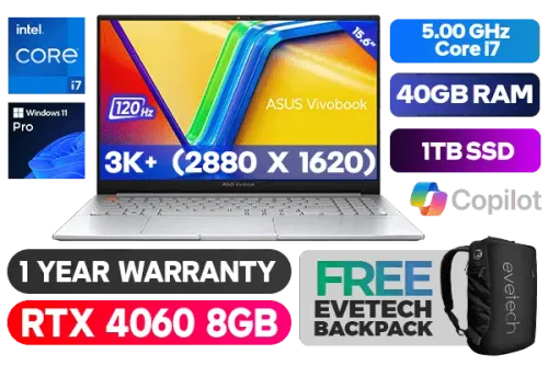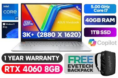 ASUS Vivobook Pro 15 OLED K6502VV Intel Core i7-13700H up to 5.00GHz Processor with Intel Turbo Boost Technology, 24MB Cache, 14x Cores, 20x Threads / 40GB DDR5 RAM / 1TB Ultra-Fast NVMe SSD / 15.6" 3K+ (2880 x 1620) 120Hz, Glossy Display / NVIDIA GeForce RTX 4060 8GB GDDR6 Dedicated Graphics / <span style="font-size: 20px; color: #00BFFF; font-weight: bold;">Windows 11 Professional (64bit)</span> / Bluetooth 5.3 / Intel Wi-Fi 6E Wireless LAN / 1080p FHD Camera With Privacy Shutter / 2 x USB 3.2 Type-A / 2 x USB 3.2 Type C / 1 x HDMI / 1x Microphone and Headphone Combo jack / 1x RJ45 / 1x SD card reader / Fingerprint Reader / White Backlit Keyboard / 1 Year Warranty / ASUS Vivobook Pro 15 OLED Intel Core i7 RTX 4060 Professional Laptop DealASUS Vivobook Pro 15 OLED K6502VV Intel Core i7-13700H up to 5.00GHz Processor with Intel Turbo Boost Technology, 24MB Cache, 14x Cores, 20x Threads / 40GB DDR5 RAM / 1TB Ultra-Fast NVMe SSD / 15.6" 3K+ (2880 x 1620) 120Hz, Glossy Display / NVIDIA GeForce RTX 4060 8GB GDDR6 Dedicated Graphics / Windows 11 Professional (64bit) / Bluetooth 5.3 / Intel Wi-Fi 6E Wireless LAN / 1080p FHD Camera With Privacy Shutter / 2 x USB 3.2 Type-A / 2 x USB 3.2 Type C / 1 x HDMI / 1x Microphone and Headphone Combo jack / 1x RJ45 / 1x SD card reader / Fingerprint Reader / White Backlit Keyboard / 1 Year Warranty / ASUS Vivobook Pro 15 OLED Intel Core i7 RTX 4060 Professional Laptop Deal [K6502VV-OI71610S0X/40GB] / [+] GET FREE EVETECH NEO Premium Gaming Backpack+ FREE DELIVERY !