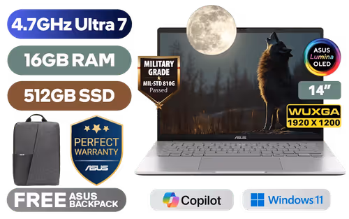 ASUS Vivobook S14 S3407AA Intel Core Ultra 7-355 up to 4.7GHz Processor, 12MB Cache, 8x Cores, 8x Threads / 16GB DDR5 RAM / 512GB Ultra-Fast NVMe SSD / 14" WUXGA (1920 x 1200) OLED Display / Integrated Intel® Graphics / Windows 11 Home (64bit) / MediaTek WiFi 6 MT7920 Wireless LAN / Bluetooth 5.4 / FHD IR Camera With Privacy Shutter / 2x USB Type-A / 2x USB Type-C (Supports DisplayPort / Power Delivery) / 1 x HDMI / 1x Microphone and Headphone Combo jack / White Backlit Keyboard / Built-In Speakers and Microphone / Free Asus Backpack / ASUS Vivobook S14 S3407 Core Ultra 7 Laptop DealASUS Vivobook S14 S3407AA Intel Core Ultra 7-355 up to 4.7GHz Processor, 12MB Cache, 8x Cores, 8x Threads / 16GB DDR5 RAM / 512GB Ultra-Fast NVMe SSD / 14" WUXGA (1920 x 1200) OLED Display / Integrated Intel® Graphics / Windows 11 Home (64bit) / MediaTek WiFi 6 MT7920 Wireless LAN / Bluetooth 5.4 / FHD IR Camera With Privacy Shutter / 2x USB Type-A / 2x USB Type-C (Supports DisplayPort / Power Delivery) / 1 x HDMI / 1x Microphone and Headphone Combo jack / White Backlit Keyboard / Built-In Speakers and Microphone / Free Asus Backpack / ASUS Vivobook S14 S3407 Core Ultra 7 Laptop Deal [S3407AA-OU716512S0W] / 3 YEARS WARRANTY + FREE DELIVERY !