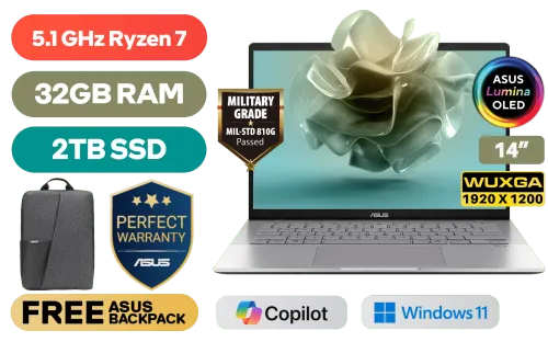 ASUS Vivobook S14 M3407HA AMD Ryzen 7 260 up to 5.1GHz Processor, 24MB Cache, 8x Cores, 16x Threads / 32GB DDR5 RAM / 2TB Ultra-Fast NVMe SSD / 14" WUXGA (1920 x 1200) OLED Display / Integrated AMD Radeon™ Graphics / Windows 11 Home (64bit) / Realtek Wi-Fi 6 8852BE Wireless LAN / Bluetooth 5.3 / FHD 1080p IR Web Camera / 2x USB Type-A / 2x USB Type-C (Supports DisplayPort / Power Delivery) / 1 x HDMI / 1x Microphone and Headphone Combo Jack / White Backlit Keyboard / Built-in Speaker and Microphone / Free ASUS Backpack/ ASUS Vivobook S14 M3407HA OLED Ryzen 7 DealASUS Vivobook S14 M3407HA AMD Ryzen 7 260 up to 5.1GHz Processor, 24MB Cache, 8x Cores, 16x Threads / 32GB DDR5 RAM / 2TB Ultra-Fast NVMe SSD / 14" WUXGA (1920 x 1200) OLED Display / Integrated AMD Radeon™ Graphics / Windows 11 Home (64bit) / Realtek Wi-Fi 6 8852BE Wireless LAN / Bluetooth 5.3 / FHD 1080p IR Web Camera / 2x USB Type-A / 2x USB Type-C (Supports DisplayPort / Power Delivery) / 1 x HDMI / 1x Microphone and Headphone Combo Jack / White Backlit Keyboard / Built-in Speaker and Microphone / Free ASUS Backpack/ ASUS Vivobook S14 M3407HA OLED Ryzen 7 Deal [M3407HA-O71610S0W/32GB/2TB] / 3 YEARS WARRANTY + FREE DELIVERY !