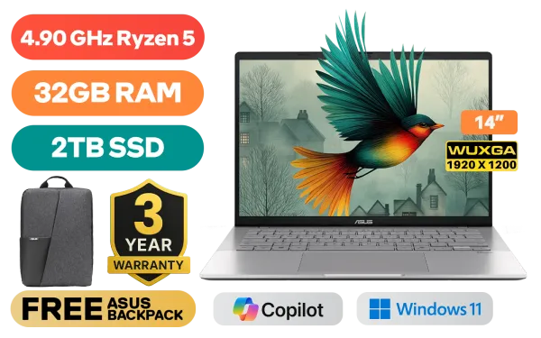 ASUS Vivobook S14 M3407HA AMD Ryzen 5 220 up to 4.90GHz Processor, 22MB Cache, 6x Cores, 12x Threads / 32GB DDR5 RAM / 2TB Ultra-Fast NVMe SSD / 14" WUXGA (1920 x 1200) OLED Display / Integrated AMD Radeon™ Graphics / Windows 11 Home (64bit) / Realtek Wi-Fi 6 8852BE Wireless LAN / Bluetooth 5.3 / FHD IR camera With privacy shutter / 2x USB Type-A / 2x USB Type-C (Supports DisplayPort / Power Delivery) / 1 x HDMI / 1x Microphone and Headphone Combo jack / White Backlit Chicklet Keyboard / Built-in Speaker and Microphone / FREE ASUS Bag / ASUS Vivobook S14 M3407HA Ryzen 5 Laptop DealASUS Vivobook S14 M3407HA AMD Ryzen 5 220 up to 4.90GHz Processor, 22MB Cache, 6x Cores, 12x Threads / 32GB DDR5 RAM / 2TB Ultra-Fast NVMe SSD / 14" WUXGA (1920 x 1200) OLED Display / Integrated AMD Radeon™ Graphics / Windows 11 Home (64bit) / Realtek Wi-Fi 6 8852BE Wireless LAN / Bluetooth 5.3 / FHD IR camera With privacy shutter / 2x USB Type-A / 2x USB Type-C (Supports DisplayPort / Power Delivery) / 1 x HDMI / 1x Microphone and Headphone Combo jack / White Backlit Chicklet Keyboard / Built-in Speaker and Microphone / FREE ASUS Bag / ASUS Vivobook S14 M3407HA Ryzen 5 Laptop Deal [M3407HA-O516512S0W/32GB/2TB] + FREE DELIVERY !