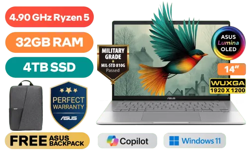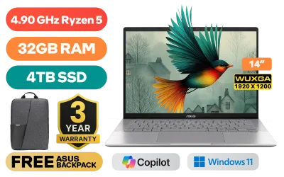 ASUS Vivobook S14 M3407HA AMD Ryzen 5 220 up to 4.90GHz Processor, 22MB Cache, 6x Cores, 12x Threads / 32GB DDR5 RAM / 4TB Ultra-Fast NVMe SSD / 14" WUXGA (1920 x 1200) OLED Display / Integrated AMD Radeon™ Graphics / Windows 11 Home (64bit) / Realtek Wi-Fi 6 8852BE Wireless LAN / Bluetooth 5.3 / FHD IR camera With privacy shutter / 2x USB Type-A / 2x USB Type-C (Supports DisplayPort / Power Delivery) / 1 x HDMI / 1x Microphone and Headphone Combo jack / White Backlit Chicklet Keyboard / Built-in Speaker and Microphone / FREE ASUS Bag / ASUS Vivobook S14 M3407HA Ryzen 5 Laptop DealASUS Vivobook S14 M3407HA AMD Ryzen 5 220 up to 4.90GHz Processor, 22MB Cache, 6x Cores, 12x Threads / 32GB DDR5 RAM / 4TB Ultra-Fast NVMe SSD / 14" WUXGA (1920 x 1200) OLED Display / Integrated AMD Radeon™ Graphics / Windows 11 Home (64bit) / Realtek Wi-Fi 6 8852BE Wireless LAN / Bluetooth 5.3 / FHD IR camera With privacy shutter / 2x USB Type-A / 2x USB Type-C (Supports DisplayPort / Power Delivery) / 1 x HDMI / 1x Microphone and Headphone Combo jack / White Backlit Chicklet Keyboard / Built-in Speaker and Microphone / FREE ASUS Bag / ASUS Vivobook S14 M3407HA Ryzen 5 Laptop Deal [M3407HA-O516512S0W/32GB/4TB] + FREE DELIVERY !