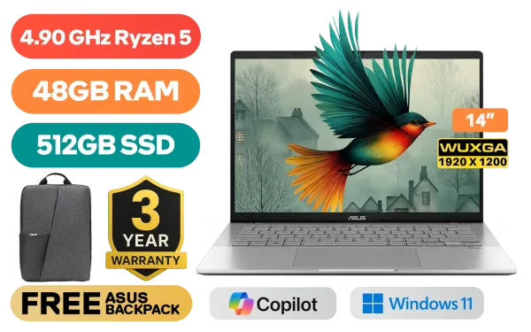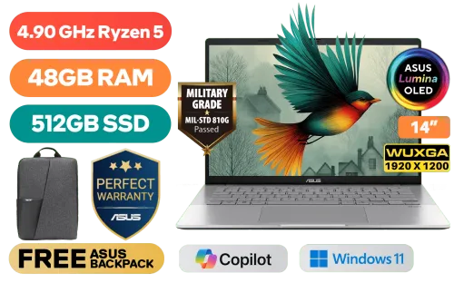 ASUS Vivobook S14 M3407HA AMD Ryzen 5 220 up to 4.90GHz Processor, 22MB Cache, 6x Cores, 12x Threads / 48GB DDR5 RAM / 512GB Ultra-Fast NVMe SSD / 14" WUXGA (1920 x 1200) OLED Display / Integrated AMD Radeon™ Graphics / Windows 11 Home (64bit) / Realtek Wi-Fi 6 8852BE Wireless LAN / Bluetooth 5.3 / FHD IR camera With privacy shutter / 2x USB Type-A / 2x USB Type-C (Supports DisplayPort / Power Delivery) / 1 x HDMI / 1x Microphone and Headphone Combo jack / White Backlit Chicklet Keyboard / Built-in Speaker and Microphone / FREE ASUS Bag / ASUS Vivobook S14 M3407HA Ryzen 5 Laptop DealASUS Vivobook S14 M3407HA AMD Ryzen 5 220 up to 4.90GHz Processor, 22MB Cache, 6x Cores, 12x Threads / 48GB DDR5 RAM / 512GB Ultra-Fast NVMe SSD / 14" WUXGA (1920 x 1200) OLED Display / Integrated AMD Radeon™ Graphics / Windows 11 Home (64bit) / Realtek Wi-Fi 6 8852BE Wireless LAN / Bluetooth 5.3 / FHD IR camera With privacy shutter / 2x USB Type-A / 2x USB Type-C (Supports DisplayPort / Power Delivery) / 1 x HDMI / 1x Microphone and Headphone Combo jack / White Backlit Chicklet Keyboard / Built-in Speaker and Microphone / FREE ASUS Bag / ASUS Vivobook S14 M3407HA Ryzen 5 Laptop Deal [M3407HA-O516512S0W/48GB] + FREE DELIVERY !