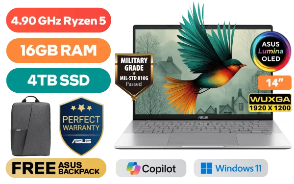 ASUS Vivobook S14 M3407HA AMD Ryzen 5 220 up to 4.90GHz Processor, 22MB Cache, 6x Cores, 12x Threads / 16GB DDR5 RAM / 4TB Ultra-Fast NVMe SSD / 14" WUXGA (1920 x 1200) OLED Display / Integrated AMD Radeon™ Graphics / Windows 11 Home (64bit) / Realtek Wi-Fi 6 8852BE Wireless LAN / Bluetooth 5.3 / FHD IR camera With privacy shutter / 2x USB Type-A / 2x USB Type-C (Supports DisplayPort / Power Delivery) / 1 x HDMI / 1x Microphone and Headphone Combo jack / White Backlit Chicklet Keyboard / Built-in Speaker and Microphone / FREE ASUS Bag / ASUS Vivobook S14 M3407HA Ryzen 5 Laptop DealASUS Vivobook S14 M3407HA AMD Ryzen 5 220 up to 4.90GHz Processor, 22MB Cache, 6x Cores, 12x Threads / 16GB DDR5 RAM / 4TB Ultra-Fast NVMe SSD / 14" WUXGA (1920 x 1200) OLED Display / Integrated AMD Radeon™ Graphics / Windows 11 Home (64bit) / Realtek Wi-Fi 6 8852BE Wireless LAN / Bluetooth 5.3 / FHD IR camera With privacy shutter / 2x USB Type-A / 2x USB Type-C (Supports DisplayPort / Power Delivery) / 1 x HDMI / 1x Microphone and Headphone Combo jack / White Backlit Chicklet Keyboard / Built-in Speaker and Microphone / FREE ASUS Bag / ASUS Vivobook S14 M3407HA Ryzen 5 Laptop Deal [M3407HA-O516512S0W/4TB] + FREE DELIVERY !