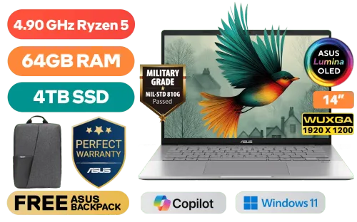 ASUS Vivobook S14 M3407HA AMD Ryzen 5 220 up to 4.90GHz Processor, 22MB Cache, 6x Cores, 12x Threads / 64GB DDR5 RAM / 4TB Ultra-Fast NVMe SSD / 14" WUXGA (1920 x 1200) OLED Display / Integrated AMD Radeon™ Graphics / Windows 11 Home (64bit) / Realtek Wi-Fi 6 8852BE Wireless LAN / Bluetooth 5.3 / FHD IR camera With privacy shutter / 2x USB Type-A / 2x USB Type-C (Supports DisplayPort / Power Delivery) / 1 x HDMI / 1x Microphone and Headphone Combo jack / White Backlit Chicklet Keyboard / Built-in Speaker and Microphone / FREE ASUS Bag / ASUS Vivobook S14 M3407HA Ryzen 5 Laptop DealASUS Vivobook S14 M3407HA AMD Ryzen 5 220 up to 4.90GHz Processor, 22MB Cache, 6x Cores, 12x Threads / 64GB DDR5 RAM / 4TB Ultra-Fast NVMe SSD / 14" WUXGA (1920 x 1200) OLED Display / Integrated AMD Radeon™ Graphics / Windows 11 Home (64bit) / Realtek Wi-Fi 6 8852BE Wireless LAN / Bluetooth 5.3 / FHD IR camera With privacy shutter / 2x USB Type-A / 2x USB Type-C (Supports DisplayPort / Power Delivery) / 1 x HDMI / 1x Microphone and Headphone Combo jack / White Backlit Chicklet Keyboard / Built-in Speaker and Microphone / FREE ASUS Bag / ASUS Vivobook S14 M3407HA Ryzen 5 Laptop Deal [M3407HA-O516512S0W/64GB/4TB] + FREE DELIVERY !