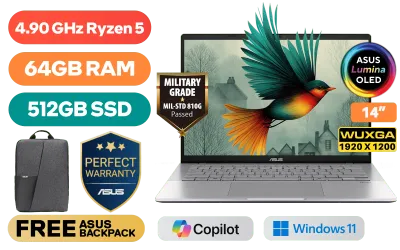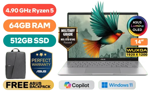 ASUS Vivobook S14 M3407HA AMD Ryzen 5 220 up to 4.90GHz Processor, 22MB Cache, 6x Cores, 12x Threads / 64GB DDR5 RAM / 512GB Ultra-Fast NVMe SSD / 14" WUXGA (1920 x 1200) OLED Display / Integrated AMD Radeon™ Graphics / Windows 11 Home (64bit) / Realtek Wi-Fi 6 8852BE Wireless LAN / Bluetooth 5.3 / FHD IR camera With privacy shutter / 2x USB Type-A / 2x USB Type-C (Supports DisplayPort / Power Delivery) / 1 x HDMI / 1x Microphone and Headphone Combo jack / White Backlit Chicklet Keyboard / Built-in Speaker and Microphone / FREE ASUS Bag / ASUS Vivobook S14 M3407HA Ryzen 5 Laptop DealASUS Vivobook S14 M3407HA AMD Ryzen 5 220 up to 4.90GHz Processor, 22MB Cache, 6x Cores, 12x Threads / 64GB DDR5 RAM / 512GB Ultra-Fast NVMe SSD / 14" WUXGA (1920 x 1200) OLED Display / Integrated AMD Radeon™ Graphics / Windows 11 Home (64bit) / Realtek Wi-Fi 6 8852BE Wireless LAN / Bluetooth 5.3 / FHD IR camera With privacy shutter / 2x USB Type-A / 2x USB Type-C (Supports DisplayPort / Power Delivery) / 1 x HDMI / 1x Microphone and Headphone Combo jack / White Backlit Chicklet Keyboard / Built-in Speaker and Microphone / FREE ASUS Bag / ASUS Vivobook S14 M3407HA Ryzen 5 Laptop Deal [M3407HA-O516512S0W/64GB] + FREE DELIVERY !