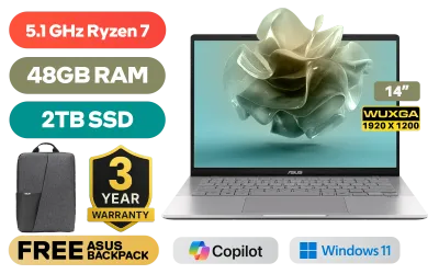 ASUS Vivobook S14 M3407HA AMD Ryzen 7 260 up to 5.1GHz Processor, 24MB Cache, 8x Cores, 16x Threads / 48GB DDR5 RAM / 2TB Ultra-Fast NVMe SSD / 14" WUXGA (1920 x 1200) OLED Display / Integrated AMD Radeon™ Graphics / Windows 11 Home (64bit) / Realtek Wi-Fi 6 8852BE Wireless LAN / Bluetooth 5.3 / FHD 1080p IR Web Camera / 2x USB Type-A / 2x USB Type-C (Supports DisplayPort / Power Delivery) / 1 x HDMI / 1x Microphone and Headphone Combo Jack / White Backlit Keyboard / Built-in Speaker and Microphone / Free ASUS Backpack/ ASUS Vivobook S14 M3407HA OLED Ryzen 7 DealASUS Vivobook S14 M3407HA AMD Ryzen 7 260 up to 5.1GHz Processor, 24MB Cache, 8x Cores, 16x Threads / 48GB DDR5 RAM / 2TB Ultra-Fast NVMe SSD / 14" WUXGA (1920 x 1200) OLED Display / Integrated AMD Radeon™ Graphics / Windows 11 Home (64bit) / Realtek Wi-Fi 6 8852BE Wireless LAN / Bluetooth 5.3 / FHD 1080p IR Web Camera / 2x USB Type-A / 2x USB Type-C (Supports DisplayPort / Power Delivery) / 1 x HDMI / 1x Microphone and Headphone Combo Jack / White Backlit Keyboard / Built-in Speaker and Microphone / Free ASUS Backpack/ ASUS Vivobook S14 M3407HA OLED Ryzen 7 Deal [M3407HA-O71610S0W/48GB/2TB] / 3 YEARS WARRANTY + FREE DELIVERY !