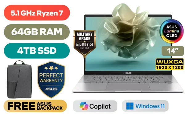 ASUS Vivobook S14 M3407HA AMD Ryzen 7 260 up to 5.1GHz Processor, 24MB Cache, 8x Cores, 16x Threads / 64GB DDR5 RAM / 4TB Ultra-Fast NVMe SSD / 14" WUXGA (1920 x 1200) OLED Display / Integrated AMD Radeon™ Graphics / Windows 11 Home (64bit) / Realtek Wi-Fi 6 8852BE Wireless LAN / Bluetooth 5.3 / FHD 1080p IR Web Camera / 2x USB Type-A / 2x USB Type-C (Supports DisplayPort / Power Delivery) / 1 x HDMI / 1x Microphone and Headphone Combo Jack / White Backlit Keyboard / Built-in Speaker and Microphone / Free ASUS Backpack/ ASUS Vivobook S14 M3407HA OLED Ryzen 7 DealASUS Vivobook S14 M3407HA AMD Ryzen 7 260 up to 5.1GHz Processor, 24MB Cache, 8x Cores, 16x Threads / 64GB DDR5 RAM / 4TB Ultra-Fast NVMe SSD / 14" WUXGA (1920 x 1200) OLED Display / Integrated AMD Radeon™ Graphics / Windows 11 Home (64bit) / Realtek Wi-Fi 6 8852BE Wireless LAN / Bluetooth 5.3 / FHD 1080p IR Web Camera / 2x USB Type-A / 2x USB Type-C (Supports DisplayPort / Power Delivery) / 1 x HDMI / 1x Microphone and Headphone Combo Jack / White Backlit Keyboard / Built-in Speaker and Microphone / Free ASUS Backpack/ ASUS Vivobook S14 M3407HA OLED Ryzen 7 Deal [M3407HA-O71610S0W/64GB/4TB] / 3 YEARS WARRANTY + FREE DELIVERY !