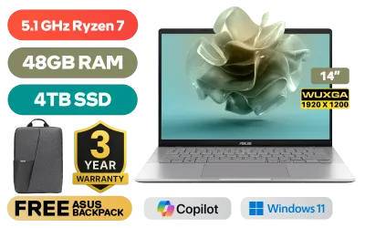 ASUS Vivobook S14 M3407HA AMD Ryzen 7 260 up to 5.1GHz Processor, 24MB Cache, 8x Cores, 16x Threads / 48GB DDR5 RAM / 4TB Ultra-Fast NVMe SSD / 14" WUXGA (1920 x 1200) OLED Display / Integrated AMD Radeon™ Graphics / Windows 11 Home (64bit) / Realtek Wi-Fi 6 8852BE Wireless LAN / Bluetooth 5.3 / FHD 1080p IR Web Camera / 2x USB Type-A / 2x USB Type-C (Supports DisplayPort / Power Delivery) / 1 x HDMI / 1x Microphone and Headphone Combo Jack / White Backlit Keyboard / Built-in Speaker and Microphone / Free ASUS Backpack/ ASUS Vivobook S14 M3407HA OLED Ryzen 7 DealASUS Vivobook S14 M3407HA AMD Ryzen 7 260 up to 5.1GHz Processor, 24MB Cache, 8x Cores, 16x Threads / 48GB DDR5 RAM / 4TB Ultra-Fast NVMe SSD / 14" WUXGA (1920 x 1200) OLED Display / Integrated AMD Radeon™ Graphics / Windows 11 Home (64bit) / Realtek Wi-Fi 6 8852BE Wireless LAN / Bluetooth 5.3 / FHD 1080p IR Web Camera / 2x USB Type-A / 2x USB Type-C (Supports DisplayPort / Power Delivery) / 1 x HDMI / 1x Microphone and Headphone Combo Jack / White Backlit Keyboard / Built-in Speaker and Microphone / Free ASUS Backpack/ ASUS Vivobook S14 M3407HA OLED Ryzen 7 Deal [M3407HA-O71610S0W/48GB/4TB] / 3 YEARS WARRANTY + FREE DELIVERY !