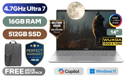 ASUS Vivobook S14 S3407AA Intel Core Ultra 7-355 up to 4.7GHz Processor, 12MB Cache, 8x Cores, 8x Threads / 16GB DDR5 RAM / 512GB Ultra-Fast NVMe SSD / 14" WUXGA (1920 x 1200) OLED Display / Integrated Intel® Graphics / Windows 11 Home (64bit) / MediaTek WiFi 6 MT7920 Wireless LAN / Bluetooth 5.4 / FHD IR Camera With Privacy Shutter / 2x USB Type-A / 2x USB Type-C (Supports DisplayPort / Power Delivery) / 1 x HDMI / 1x Microphone and Headphone Combo jack / White Backlit Keyboard / Built-In Speakers and Microphone / Free Asus Backpack / ASUS Vivobook S14 S3407 Core Ultra 7 Laptop DealASUS Vivobook S14 S3407AA Intel Core Ultra 7-355 up to 4.7GHz Processor, 12MB Cache, 8x Cores, 8x Threads / 16GB DDR5 RAM / 512GB Ultra-Fast NVMe SSD / 14" WUXGA (1920 x 1200) OLED Display / Integrated Intel® Graphics / Windows 11 Home (64bit) / MediaTek WiFi 6 MT7920 Wireless LAN / Bluetooth 5.4 / FHD IR Camera With Privacy Shutter / 2x USB Type-A / 2x USB Type-C (Supports DisplayPort / Power Delivery) / 1 x HDMI / 1x Microphone and Headphone Combo jack / White Backlit Keyboard / Built-In Speakers and Microphone / Free Asus Backpack / ASUS Vivobook S14 S3407 Core Ultra 7 Laptop Deal [S3407AA-OU716512S0W] / 3 YEARS WARRANTY + FREE DELIVERY !