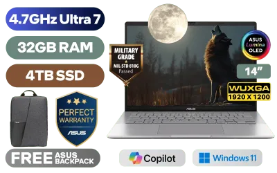 ASUS Vivobook S14 S3407AA Intel Core Ultra 7-355 up to 4.7GHz Processor, 12MB Cache, 8x Cores, 8x Threads / 32GB DDR5 RAM / 4TB Ultra-Fast NVMe SSD / 14" WUXGA (1920 x 1200) OLED Display / Integrated Intel® Graphics / Windows 11 Home (64bit) / MediaTek WiFi 6 MT7920 Wireless LAN / Bluetooth 5.4 / FHD IR Camera With Privacy Shutter / 2x USB Type-A / 2x USB Type-C (Supports DisplayPort / Power Delivery) / 1 x HDMI / 1x Microphone and Headphone Combo jack / White Backlit Keyboard / Built-In Speakers and Microphone / Free Asus Backpack / ASUS Vivobook S14 S3407 Core Ultra 7 Laptop DealASUS Vivobook S14 S3407AA Intel Core Ultra 7-355 up to 4.7GHz Processor, 12MB Cache, 8x Cores, 8x Threads / 32GB DDR5 RAM / 4TB Ultra-Fast NVMe SSD / 14" WUXGA (1920 x 1200) OLED Display / Integrated Intel® Graphics / Windows 11 Home (64bit) / MediaTek WiFi 6 MT7920 Wireless LAN / Bluetooth 5.4 / FHD IR Camera With Privacy Shutter / 2x USB Type-A / 2x USB Type-C (Supports DisplayPort / Power Delivery) / 1 x HDMI / 1x Microphone and Headphone Combo jack / White Backlit Keyboard / Built-In Speakers and Microphone / Free Asus Backpack / ASUS Vivobook S14 S3407 Core Ultra 7 Laptop Deal [S3407AA-OU716512S0W/32GB/4TB] / 3 YEARS WARRANTY + FREE DELIVERY !