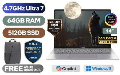 ASUS Vivobook S14 S3407AA Intel Core Ultra 7-355 up to 4.7GHz Processor, 12MB Cache, 8x Cores, 8x Threads / 64GB DDR5 RAM / 512GB Ultra-Fast NVMe SSD / 14" WUXGA (1920 x 1200) OLED Display / Integrated Intel® Graphics / Windows 11 Home (64bit) / MediaTek WiFi 6 MT7920 Wireless LAN / Bluetooth 5.4 / FHD IR Camera With Privacy Shutter / 2x USB Type-A / 2x USB Type-C (Supports DisplayPort / Power Delivery) / 1 x HDMI / 1x Microphone and Headphone Combo jack / White Backlit Keyboard / Built-In Speakers and Microphone / Free Asus Backpack / ASUS Vivobook S14 S3407 Core Ultra 7 Laptop DealASUS Vivobook S14 S3407AA Intel Core Ultra 7-355 up to 4.7GHz Processor, 12MB Cache, 8x Cores, 8x Threads / 64GB DDR5 RAM / 512GB Ultra-Fast NVMe SSD / 14" WUXGA (1920 x 1200) OLED Display / Integrated Intel® Graphics / Windows 11 Home (64bit) / MediaTek WiFi 6 MT7920 Wireless LAN / Bluetooth 5.4 / FHD IR Camera With Privacy Shutter / 2x USB Type-A / 2x USB Type-C (Supports DisplayPort / Power Delivery) / 1 x HDMI / 1x Microphone and Headphone Combo jack / White Backlit Keyboard / Built-In Speakers and Microphone / Free Asus Backpack / ASUS Vivobook S14 S3407 Core Ultra 7 Laptop Deal [S3407AA-OU716512S0W/64GB] / 3 YEARS WARRANTY + FREE DELIVERY !