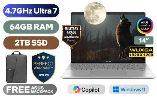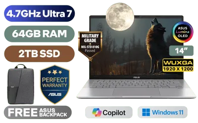 ASUS Vivobook S14 S3407AA Intel Core Ultra 7-355 up to 4.7GHz Processor, 12MB Cache, 8x Cores, 8x Threads / 64GB DDR5 RAM / 2TB Ultra-Fast NVMe SSD / 14" WUXGA (1920 x 1200) OLED Display / Integrated Intel® Graphics / Windows 11 Home (64bit) / MediaTek WiFi 6 MT7920 Wireless LAN / Bluetooth 5.4 / FHD IR Camera With Privacy Shutter / 2x USB Type-A / 2x USB Type-C (Supports DisplayPort / Power Delivery) / 1 x HDMI / 1x Microphone and Headphone Combo jack / White Backlit Keyboard / Built-In Speakers and Microphone / Free Asus Backpack / ASUS Vivobook S14 S3407 Core Ultra 7 Laptop DealASUS Vivobook S14 S3407AA Intel Core Ultra 7-355 up to 4.7GHz Processor, 12MB Cache, 8x Cores, 8x Threads / 64GB DDR5 RAM / 2TB Ultra-Fast NVMe SSD / 14" WUXGA (1920 x 1200) OLED Display / Integrated Intel® Graphics / Windows 11 Home (64bit) / MediaTek WiFi 6 MT7920 Wireless LAN / Bluetooth 5.4 / FHD IR Camera With Privacy Shutter / 2x USB Type-A / 2x USB Type-C (Supports DisplayPort / Power Delivery) / 1 x HDMI / 1x Microphone and Headphone Combo jack / White Backlit Keyboard / Built-In Speakers and Microphone / Free Asus Backpack / ASUS Vivobook S14 S3407 Core Ultra 7 Laptop Deal [S3407AA-OU716512S0W/64GB/2TB] / 3 YEARS WARRANTY + FREE DELIVERY !
