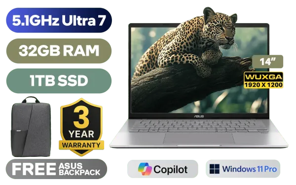 ASUS Vivobook S14 S3407CA Intel® Core™ Ultra 7-255H up to 5.1GHz Processor, 24MB Cache, 16x Cores, 16x Threads / 32GB DDR5 RAM / 1TB Ultra-Fast NVMe SSD / 14" WUXGA (1920 x 1200) IPS-level Display / Integrated Intel® Arc 140T Graphics / <span style="font-size: 20px; color: #00BFFF; font-weight: bold;">Windows 11 Professional (64bit)</span> / RealTek Wi-Fi 6 8852BE Wireless LAN / Bluetooth 5.3 / FHD IR Camera With Privacy Shutter / 2x USB Type-A / 2x USB Type-C (Supports DisplayPort / Power Delivery) / 1 x HDMI / 1x Microphone and Headphone Combo jack / White Backlit Keyboard / Built-In Speakers and Microphone / Free Asus Backpack / ASUS Vivobook S14 S3407CA Core Ultra 7 Laptop DealASUS Vivobook S14 S3407CA Intel® Core™ Ultra 7-255H up to 5.1GHz Processor, 24MB Cache, 16x Cores, 16x Threads / 32GB DDR5 RAM / 1TB Ultra-Fast NVMe SSD / 14" WUXGA (1920 x 1200) IPS-level Display / Integrated Intel® Arc 140T Graphics / Windows 11 Professional (64bit) / RealTek Wi-Fi 6 8852BE Wireless LAN / Bluetooth 5.3 / FHD IR Camera With Privacy Shutter / 2x USB Type-A / 2x USB Type-C (Supports DisplayPort / Power Delivery) / 1 x HDMI / 1x Microphone and Headphone Combo jack / White Backlit Keyboard / Built-In Speakers and Microphone / Free Asus Backpack / ASUS Vivobook S14 S3407CA Core Ultra 7 Laptop Deal [S3407CA-LY107X-3YRS/32GB] / 3 YEARS WARRANTY + FREE DELIVERY !