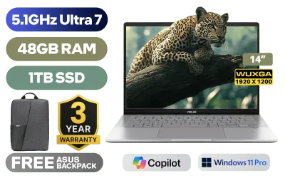 ASUS Vivobook S14 S3407CA Intel® Core™ Ultra 7-255H up to 5.1GHz Processor, 24MB Cache, 16x Cores, 16x Threads / 48GB DDR5 RAM / 1TB Ultra-Fast NVMe SSD / 14" WUXGA (1920 x 1200) IPS-level Display / Integrated Intel® Arc 140T Graphics / <span style="font-size: 20px; color: #00BFFF; font-weight: bold;">Windows 11 Professional (64bit)</span> / RealTek Wi-Fi 6 8852BE Wireless LAN / Bluetooth 5.3 / FHD IR Camera With Privacy Shutter / 2x USB Type-A / 2x USB Type-C (Supports DisplayPort / Power Delivery) / 1 x HDMI / 1x Microphone and Headphone Combo jack / White Backlit Keyboard / Built-In Speakers and Microphone / Free Asus Backpack / ASUS Vivobook S14 S3407CA Core Ultra 7 Laptop DealASUS Vivobook S14 S3407CA Intel® Core™ Ultra 7-255H up to 5.1GHz Processor, 24MB Cache, 16x Cores, 16x Threads / 48GB DDR5 RAM / 1TB Ultra-Fast NVMe SSD / 14" WUXGA (1920 x 1200) IPS-level Display / Integrated Intel® Arc 140T Graphics / Windows 11 Professional (64bit) / RealTek Wi-Fi 6 8852BE Wireless LAN / Bluetooth 5.3 / FHD IR Camera With Privacy Shutter / 2x USB Type-A / 2x USB Type-C (Supports DisplayPort / Power Delivery) / 1 x HDMI / 1x Microphone and Headphone Combo jack / White Backlit Keyboard / Built-In Speakers and Microphone / Free Asus Backpack / ASUS Vivobook S14 S3407CA Core Ultra 7 Laptop Deal [S3407CA-LY107X-3YRS/48GB] / 3 YEARS WARRANTY + FREE DELIVERY !