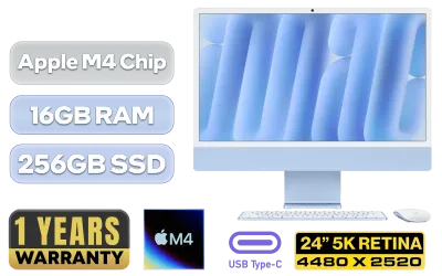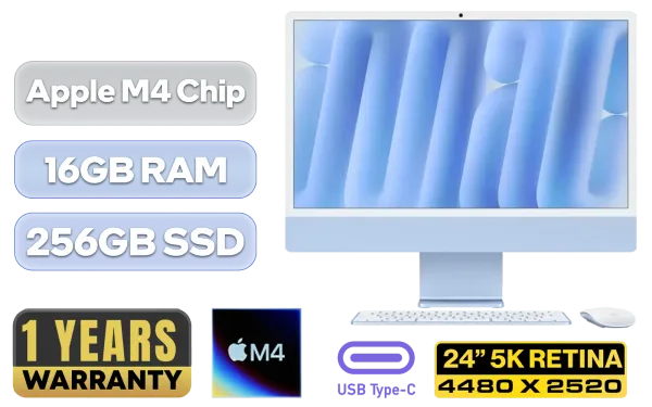 iMac 24" All-in-One Apple M4 Chip with 10-Core CPU (4 Performance Cores + 6 Efficiency Cores), 16-Core Neural Engine / 10-Core GPU with Hardware-Accelerated Ray Tracing / 16GB Unified RAM / 256GB Ultra-Fast SSD / 24" 4.5K Retina (4480 x 2520) Display / macOS Sequoia / 1080p HD Camera / Apple Wi-Fi 6E Wireless Chip / Bluetooth 5.3 / 4x USB Type-C (Thunderbolt 4, DisplayPort) / 1x Microphone & Headphone Combo Jack / Gigabit Ethernet (On Power Adapter) / 6-Speaker Sound System with Spatial Audio & Dolby Atmos / Touch ID / Free Magic Keyboard & Mouse / 1-Year Warranty / iMac 24" M4 (256GB) - BlueiMac 24" All-in-One Apple M4 Chip with 10-Core CPU (4 Performance Cores + 6 Efficiency Cores), 16-Core Neural Engine / 10-Core GPU with Hardware-Accelerated Ray Tracing / 16GB Unified RAM / 256GB Ultra-Fast SSD / 24" 4.5K Retina (4480 x 2520) Display / macOS Sequoia / 1080p HD Camera / Apple Wi-Fi 6E Wireless Chip / Bluetooth 5.3 / 4x USB Type-C (Thunderbolt 4, DisplayPort) / 1x Microphone & Headphone Combo Jack / Gigabit Ethernet (On Power Adapter) / 6-Speaker Sound System with Spatial Audio & Dolby Atmos / Touch ID / Free Magic Keyboard & Mouse / 1-Year Warranty / iMac 24" M4 (256GB) - Blue [MWV13SO/A] + FREE DELIVERY !
