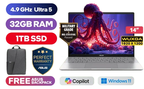 ASUS Vivobook S14 S3407CA Intel® Core™ Ultra 5-225H up to 4.9GHz Processor, 18MB Cache, 14x Cores, 14x Threads / 32GB DDR5 RAM / 1TB Ultra-Fast NVMe SSD / 14" WUXGA (1920 x 1200) Anti-Glare Display / Integrated Intel® Graphics / Windows 11 Home (64bit) / 1080p FHD IR camera With privacy shutter / Realtek Wi-Fi 6 8852BE Wireless LAN / Bluetooth 5.3 / 2x USB Type-A / 2x USB Type-C / 1 x HDMI / 1x Microphone and Headphone Combo jack / White Backlit Keyboard / Dolby Atmos Audio System / Free Asus Backpack / ASUS Vivobook S14 S3407CA Core Ultra 5 Laptop DealASUS Vivobook S14 S3407CA Intel® Core™ Ultra 5-225H up to 4.9GHz Processor, 18MB Cache, 14x Cores, 14x Threads / 32GB DDR5 RAM / 1TB Ultra-Fast NVMe SSD / 14" WUXGA (1920 x 1200) Anti-Glare Display / Integrated Intel® Graphics / Windows 11 Home (64bit) / 1080p FHD IR camera With privacy shutter / Realtek Wi-Fi 6 8852BE Wireless LAN / Bluetooth 5.3 / 2x USB Type-A / 2x USB Type-C / 1 x HDMI / 1x Microphone and Headphone Combo jack / White Backlit Keyboard / Dolby Atmos Audio System / Free Asus Backpack / ASUS Vivobook S14 S3407CA Core Ultra 5 Laptop Deal [S3407CA-U516512S0W/32GB/1TB] / 3 YEARS WARRANTY + FREE DELIVERY !
