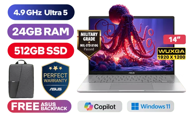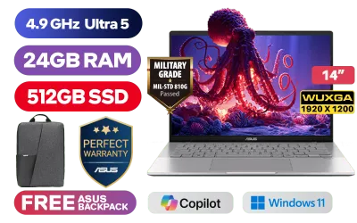 ASUS Vivobook S14 S3407CA Intel® Core™ Ultra 5-225H up to 4.9GHz Processor, 18MB Cache, 14x Cores, 14x Threads / 24GB DDR5 RAM / 512GB Ultra-Fast NVMe SSD / 14" WUXGA (1920 x 1200) Anti-Glare Display / Integrated Intel® Graphics / Windows 11 Home (64bit) / 1080p FHD IR camera With privacy shutter / Realtek Wi-Fi 6 8852BE Wireless LAN / Bluetooth 5.3 / 2x USB Type-A / 2x USB Type-C / 1 x HDMI / 1x Microphone and Headphone Combo jack / White Backlit Keyboard / Dolby Atmos Audio System / Free Asus Backpack / ASUS Vivobook S14 S3407CA Core Ultra 5 Laptop DealASUS Vivobook S14 S3407CA Intel® Core™ Ultra 5-225H up to 4.9GHz Processor, 18MB Cache, 14x Cores, 14x Threads / 24GB DDR5 RAM / 512GB Ultra-Fast NVMe SSD / 14" WUXGA (1920 x 1200) Anti-Glare Display / Integrated Intel® Graphics / Windows 11 Home (64bit) / 1080p FHD IR camera With privacy shutter / Realtek Wi-Fi 6 8852BE Wireless LAN / Bluetooth 5.3 / 2x USB Type-A / 2x USB Type-C / 1 x HDMI / 1x Microphone and Headphone Combo jack / White Backlit Keyboard / Dolby Atmos Audio System / Free Asus Backpack / ASUS Vivobook S14 S3407CA Core Ultra 5 Laptop Deal [S3407CA-U516512S0W/24GB] / 3 YEARS WARRANTY + FREE DELIVERY !
