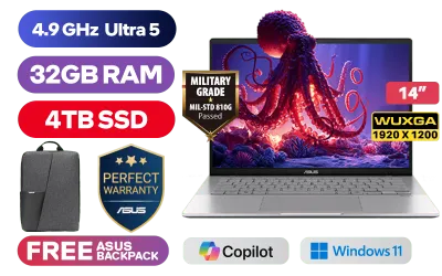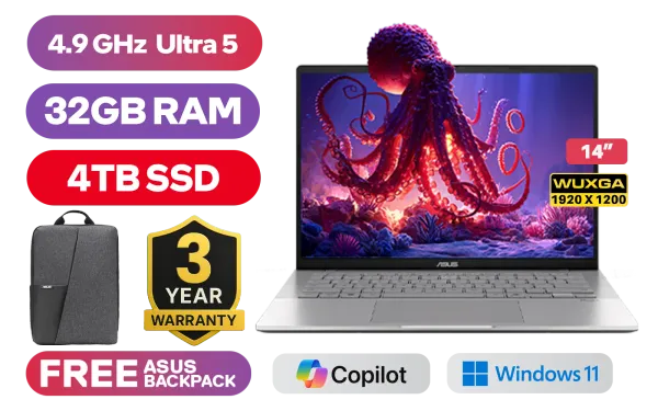 ASUS Vivobook S14 S3407CA Intel® Core™ Ultra 5-225H up to 4.9GHz Processor, 18MB Cache, 14x Cores, 14x Threads / 32GB DDR5 RAM / 4TB Ultra-Fast NVMe SSD / 14" WUXGA (1920 x 1200) Anti-Glare Display / Integrated Intel® Graphics / Windows 11 Home (64bit) / 1080p FHD IR camera With privacy shutter / Realtek Wi-Fi 6 8852BE Wireless LAN / Bluetooth 5.3 / 2x USB Type-A / 2x USB Type-C / 1 x HDMI / 1x Microphone and Headphone Combo jack / White Backlit Keyboard / Dolby Atmos Audio System / Free Asus Backpack / ASUS Vivobook S14 S3407CA Core Ultra 5 Laptop DealASUS Vivobook S14 S3407CA Intel® Core™ Ultra 5-225H up to 4.9GHz Processor, 18MB Cache, 14x Cores, 14x Threads / 32GB DDR5 RAM / 4TB Ultra-Fast NVMe SSD / 14" WUXGA (1920 x 1200) Anti-Glare Display / Integrated Intel® Graphics / Windows 11 Home (64bit) / 1080p FHD IR camera With privacy shutter / Realtek Wi-Fi 6 8852BE Wireless LAN / Bluetooth 5.3 / 2x USB Type-A / 2x USB Type-C / 1 x HDMI / 1x Microphone and Headphone Combo jack / White Backlit Keyboard / Dolby Atmos Audio System / Free Asus Backpack / ASUS Vivobook S14 S3407CA Core Ultra 5 Laptop Deal [S3407CA-U516512S0W/32GB/4TB] / 3 YEARS WARRANTY + FREE DELIVERY !