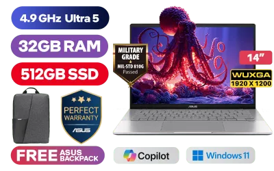 ASUS Vivobook S14 S3407CA Intel® Core™ Ultra 5-225H up to 4.9GHz Processor, 18MB Cache, 14x Cores, 14x Threads / 32GB DDR5 RAM / 512GB Ultra-Fast NVMe SSD / 14" WUXGA (1920 x 1200) Anti-Glare Display / Integrated Intel® Graphics / Windows 11 Home (64bit) / 1080p FHD IR camera With privacy shutter / Realtek Wi-Fi 6 8852BE Wireless LAN / Bluetooth 5.3 / 2x USB Type-A / 2x USB Type-C / 1 x HDMI / 1x Microphone and Headphone Combo jack / White Backlit Keyboard / Dolby Atmos Audio System / Free Asus Backpack / ASUS Vivobook S14 S3407CA Core Ultra 5 Laptop DealASUS Vivobook S14 S3407CA Intel® Core™ Ultra 5-225H up to 4.9GHz Processor, 18MB Cache, 14x Cores, 14x Threads / 32GB DDR5 RAM / 512GB Ultra-Fast NVMe SSD / 14" WUXGA (1920 x 1200) Anti-Glare Display / Integrated Intel® Graphics / Windows 11 Home (64bit) / 1080p FHD IR camera With privacy shutter / Realtek Wi-Fi 6 8852BE Wireless LAN / Bluetooth 5.3 / 2x USB Type-A / 2x USB Type-C / 1 x HDMI / 1x Microphone and Headphone Combo jack / White Backlit Keyboard / Dolby Atmos Audio System / Free Asus Backpack / ASUS Vivobook S14 S3407CA Core Ultra 5 Laptop Deal [S3407CA-U516512S0W/32GB] / 3 YEARS WARRANTY + FREE DELIVERY !