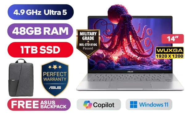 ASUS Vivobook S14 S3407CA Intel® Core™ Ultra 5-225H up to 4.9GHz Processor, 18MB Cache, 14x Cores, 14x Threads / 48GB DDR5 RAM / 1TB Ultra-Fast NVMe SSD / 14" WUXGA (1920 x 1200) Anti-Glare Display / Integrated Intel® Graphics / Windows 11 Home (64bit) / 1080p FHD IR camera With privacy shutter / Realtek Wi-Fi 6 8852BE Wireless LAN / Bluetooth 5.3 / 2x USB Type-A / 2x USB Type-C / 1 x HDMI / 1x Microphone and Headphone Combo jack / White Backlit Keyboard / Dolby Atmos Audio System / Free Asus Backpack / ASUS Vivobook S14 S3407CA Core Ultra 5 Laptop DealASUS Vivobook S14 S3407CA Intel® Core™ Ultra 5-225H up to 4.9GHz Processor, 18MB Cache, 14x Cores, 14x Threads / 48GB DDR5 RAM / 1TB Ultra-Fast NVMe SSD / 14" WUXGA (1920 x 1200) Anti-Glare Display / Integrated Intel® Graphics / Windows 11 Home (64bit) / 1080p FHD IR camera With privacy shutter / Realtek Wi-Fi 6 8852BE Wireless LAN / Bluetooth 5.3 / 2x USB Type-A / 2x USB Type-C / 1 x HDMI / 1x Microphone and Headphone Combo jack / White Backlit Keyboard / Dolby Atmos Audio System / Free Asus Backpack / ASUS Vivobook S14 S3407CA Core Ultra 5 Laptop Deal [S3407CA-U516512S0W/48GB/1TB] / 3 YEARS WARRANTY + FREE DELIVERY !