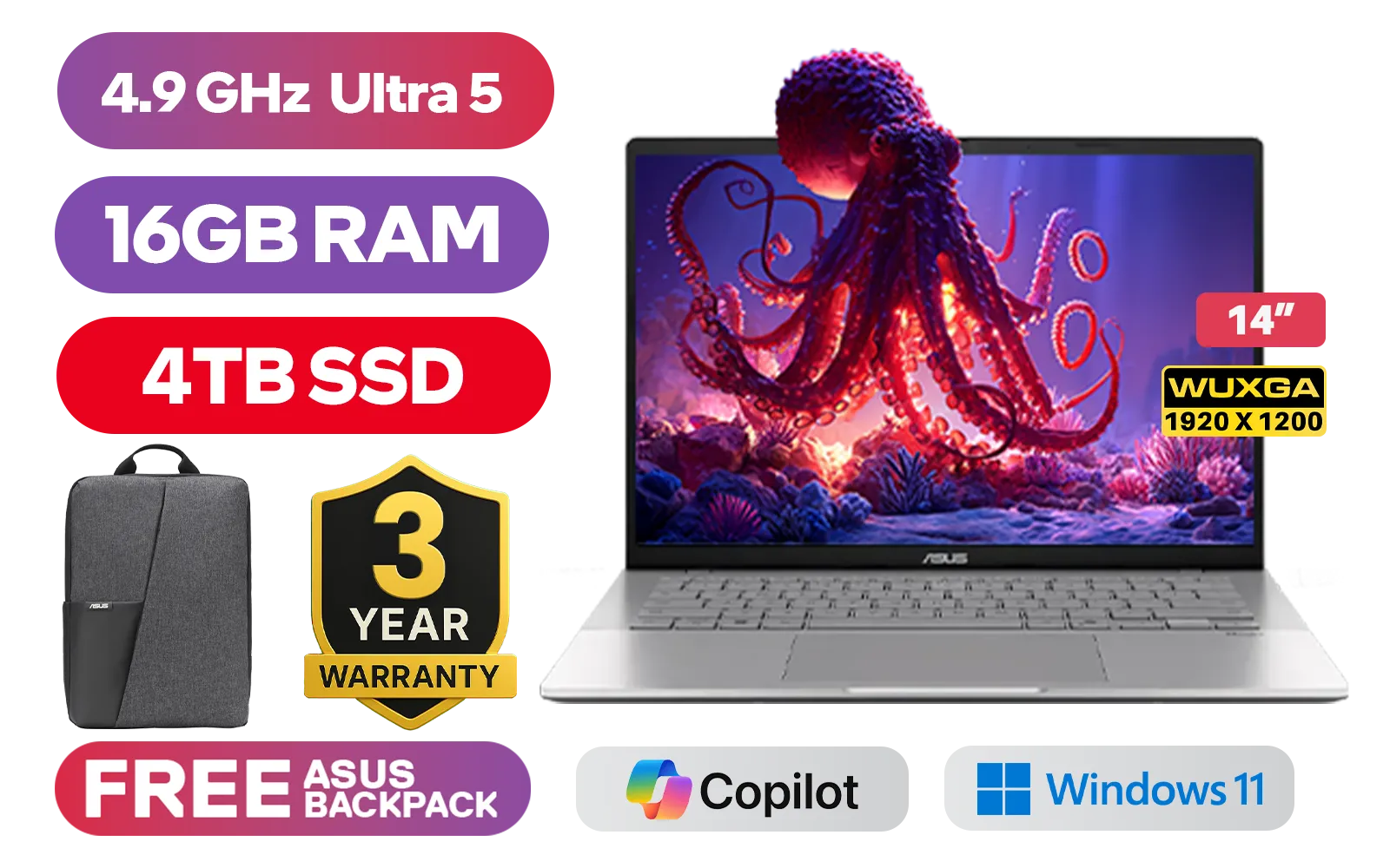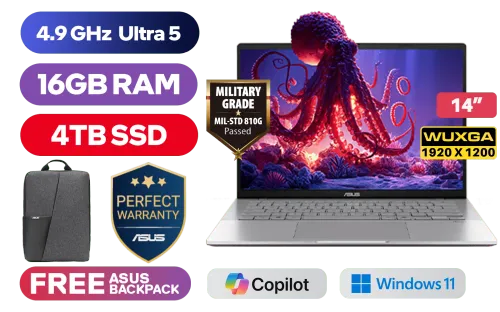 ASUS Vivobook S14 S3407CA Intel® Core™ Ultra 5-225H up to 4.9GHz Processor, 18MB Cache, 14x Cores, 14x Threads / 16GB DDR5 RAM / 4TB Ultra-Fast NVMe SSD / 14" WUXGA (1920 x 1200) Anti-Glare Display / Integrated Intel® Graphics / Windows 11 Home (64bit) / 1080p FHD IR camera With privacy shutter / Realtek Wi-Fi 6 8852BE Wireless LAN / Bluetooth 5.3 / 2x USB Type-A / 2x USB Type-C / 1 x HDMI / 1x Microphone and Headphone Combo jack / White Backlit Keyboard / Dolby Atmos Audio System / Free Asus Backpack / ASUS Vivobook S14 S3407CA Core Ultra 5 Laptop DealASUS Vivobook S14 S3407CA Intel® Core™ Ultra 5-225H up to 4.9GHz Processor, 18MB Cache, 14x Cores, 14x Threads / 16GB DDR5 RAM / 4TB Ultra-Fast NVMe SSD / 14" WUXGA (1920 x 1200) Anti-Glare Display / Integrated Intel® Graphics / Windows 11 Home (64bit) / 1080p FHD IR camera With privacy shutter / Realtek Wi-Fi 6 8852BE Wireless LAN / Bluetooth 5.3 / 2x USB Type-A / 2x USB Type-C / 1 x HDMI / 1x Microphone and Headphone Combo jack / White Backlit Keyboard / Dolby Atmos Audio System / Free Asus Backpack / ASUS Vivobook S14 S3407CA Core Ultra 5 Laptop Deal [S3407CA-U516512S0W/4TB] / 3 YEARS WARRANTY + FREE DELIVERY !