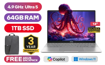 ASUS Vivobook S14 S3407CA Intel® Core™ Ultra 5-225H up to 4.9GHz Processor, 18MB Cache, 14x Cores, 14x Threads / 64GB DDR5 RAM / 1TB Ultra-Fast NVMe SSD / 14" WUXGA (1920 x 1200) Anti-Glare Display / Integrated Intel® Graphics / Windows 11 Home (64bit) / 1080p FHD IR camera With privacy shutter / Realtek Wi-Fi 6 8852BE Wireless LAN / Bluetooth 5.3 / 2x USB Type-A / 2x USB Type-C / 1 x HDMI / 1x Microphone and Headphone Combo jack / White Backlit Keyboard / Dolby Atmos Audio System / Free Asus Backpack / ASUS Vivobook S14 S3407CA Core Ultra 5 Laptop DealASUS Vivobook S14 S3407CA Intel® Core™ Ultra 5-225H up to 4.9GHz Processor, 18MB Cache, 14x Cores, 14x Threads / 64GB DDR5 RAM / 1TB Ultra-Fast NVMe SSD / 14" WUXGA (1920 x 1200) Anti-Glare Display / Integrated Intel® Graphics / Windows 11 Home (64bit) / 1080p FHD IR camera With privacy shutter / Realtek Wi-Fi 6 8852BE Wireless LAN / Bluetooth 5.3 / 2x USB Type-A / 2x USB Type-C / 1 x HDMI / 1x Microphone and Headphone Combo jack / White Backlit Keyboard / Dolby Atmos Audio System / Free Asus Backpack / ASUS Vivobook S14 S3407CA Core Ultra 5 Laptop Deal [S3407CA-U516512S0W/64GB/1TB] / 3 YEARS WARRANTY + FREE DELIVERY !
