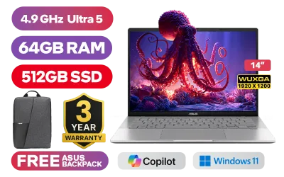 ASUS Vivobook S14 S3407CA Intel® Core™ Ultra 5-225H up to 4.9GHz Processor, 18MB Cache, 14x Cores, 14x Threads / 64GB DDR5 RAM / 512GB Ultra-Fast NVMe SSD / 14" WUXGA (1920 x 1200) Anti-Glare Display / Integrated Intel® Graphics / Windows 11 Home (64bit) / 1080p FHD IR camera With privacy shutter / Realtek Wi-Fi 6 8852BE Wireless LAN / Bluetooth 5.3 / 2x USB Type-A / 2x USB Type-C / 1 x HDMI / 1x Microphone and Headphone Combo jack / White Backlit Keyboard / Dolby Atmos Audio System / Free Asus Backpack / ASUS Vivobook S14 S3407CA Core Ultra 5 Laptop DealASUS Vivobook S14 S3407CA Intel® Core™ Ultra 5-225H up to 4.9GHz Processor, 18MB Cache, 14x Cores, 14x Threads / 64GB DDR5 RAM / 512GB Ultra-Fast NVMe SSD / 14" WUXGA (1920 x 1200) Anti-Glare Display / Integrated Intel® Graphics / Windows 11 Home (64bit) / 1080p FHD IR camera With privacy shutter / Realtek Wi-Fi 6 8852BE Wireless LAN / Bluetooth 5.3 / 2x USB Type-A / 2x USB Type-C / 1 x HDMI / 1x Microphone and Headphone Combo jack / White Backlit Keyboard / Dolby Atmos Audio System / Free Asus Backpack / ASUS Vivobook S14 S3407CA Core Ultra 5 Laptop Deal [S3407CA-U516512S0W/64GB] / 3 YEARS WARRANTY + FREE DELIVERY !