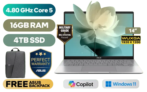 ASUS Vivobook S14 S3407VA Intel® Core™ 5-210H up to 4.80GHz Processor, 12MB Cache, 8x Cores, 12x Threads / 16GB DDR5 RAM / 4TB Ultra-Fast NVMe SSD / 14" WUXGA (1920 x 1200) Anti-Glare IPS-Level Display / Integrated Intel® Graphics / Windows 11 Home (64bit) / Realtek Wi-Fi 6 8852BE Wireless LAN / Bluetooth 5.3 / 1080p FHD IR camera With privacy shutter / 2x USB Type-A / 2x USB Type-C (Supports for Display / Power Delivery) / 1 x HDMI / 1x Microphone and Headphone Combo jack / White Backlit Chicklet Keyboard / 2x 2W Integrated Speakers / FREE Asus Backpack / ASUS Vivobook S14 S3407VA Core 5 Laptop DealASUS Vivobook S14 S3407VA Intel® Core™ 5-210H up to 4.80GHz Processor, 12MB Cache, 8x Cores, 12x Threads / 16GB DDR5 RAM / 4TB Ultra-Fast NVMe SSD / 14" WUXGA (1920 x 1200) Anti-Glare IPS-Level Display / Integrated Intel® Graphics / Windows 11 Home (64bit) / Realtek Wi-Fi 6 8852BE Wireless LAN / Bluetooth 5.3 / 1080p FHD IR camera With privacy shutter / 2x USB Type-A / 2x USB Type-C (Supports for Display / Power Delivery) / 1 x HDMI / 1x Microphone and Headphone Combo jack / White Backlit Chicklet Keyboard / 2x 2W Integrated Speakers / FREE Asus Backpack / ASUS Vivobook S14 S3407VA Core 5 Laptop Deal [S3407VA-I516512S1W/4TB] / 3 YEARS WARRANTY / [+] GET FREE Logitech M185 Wireless Mouse+ FREE DELIVERY !