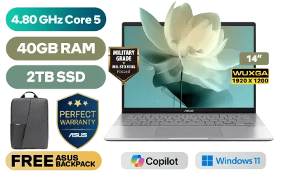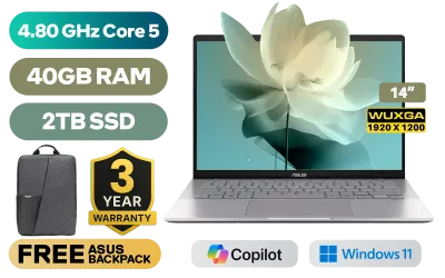 ASUS Vivobook S14 S3407VA Intel® Core™ 5-210H up to 4.80GHz Processor, 12MB Cache, 8x Cores, 12x Threads / 40GB DDR5 RAM / 2TB Ultra-Fast NVMe SSD / 14" WUXGA (1920 x 1200) Anti-Glare IPS-Level Display / Integrated Intel® Graphics / Windows 11 Home (64bit) / Realtek Wi-Fi 6 8852BE Wireless LAN / Bluetooth 5.3 / 1080p FHD IR camera With privacy shutter / 2x USB Type-A / 2x USB Type-C (Supports for Display / Power Delivery) / 1 x HDMI / 1x Microphone and Headphone Combo jack / White Backlit Chicklet Keyboard / 2x 2W Integrated Speakers / FREE Asus Backpack / ASUS Vivobook S14 S3407VA Core 5 Laptop DealASUS Vivobook S14 S3407VA Intel® Core™ 5-210H up to 4.80GHz Processor, 12MB Cache, 8x Cores, 12x Threads / 40GB DDR5 RAM / 2TB Ultra-Fast NVMe SSD / 14" WUXGA (1920 x 1200) Anti-Glare IPS-Level Display / Integrated Intel® Graphics / Windows 11 Home (64bit) / Realtek Wi-Fi 6 8852BE Wireless LAN / Bluetooth 5.3 / 1080p FHD IR camera With privacy shutter / 2x USB Type-A / 2x USB Type-C (Supports for Display / Power Delivery) / 1 x HDMI / 1x Microphone and Headphone Combo jack / White Backlit Chicklet Keyboard / 2x 2W Integrated Speakers / FREE Asus Backpack / ASUS Vivobook S14 S3407VA Core 5 Laptop Deal [S3407VA-I516512S1W/40GB/2TB] / 3 YEARS WARRANTY / [+] GET FREE Logitech M185 Wireless Mouse+ FREE DELIVERY !