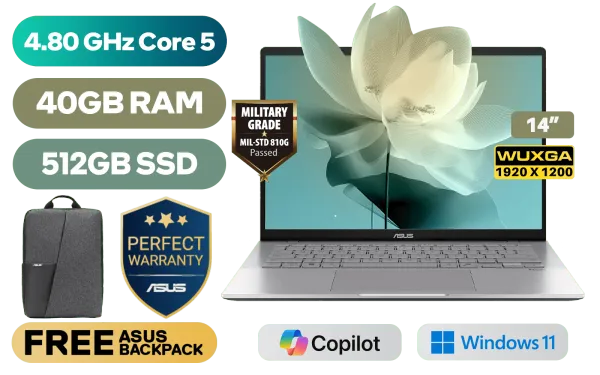 ASUS Vivobook S14 S3407VA Intel® Core™ 5-210H up to 4.80GHz Processor, 12MB Cache, 8x Cores, 12x Threads / 40GB DDR5 RAM / 512GB Ultra-Fast NVMe SSD / 14" WUXGA (1920 x 1200) Anti-Glare IPS-Level Display / Integrated Intel® Graphics / Windows 11 Home (64bit) / Realtek Wi-Fi 6 8852BE Wireless LAN / Bluetooth 5.3 / 1080p FHD IR camera With privacy shutter / 2x USB Type-A / 2x USB Type-C (Supports for Display / Power Delivery) / 1 x HDMI / 1x Microphone and Headphone Combo jack / White Backlit Chicklet Keyboard / 2x 2W Integrated Speakers / FREE Asus Backpack / ASUS Vivobook S14 S3407VA Core 5 Laptop DealASUS Vivobook S14 S3407VA Intel® Core™ 5-210H up to 4.80GHz Processor, 12MB Cache, 8x Cores, 12x Threads / 40GB DDR5 RAM / 512GB Ultra-Fast NVMe SSD / 14" WUXGA (1920 x 1200) Anti-Glare IPS-Level Display / Integrated Intel® Graphics / Windows 11 Home (64bit) / Realtek Wi-Fi 6 8852BE Wireless LAN / Bluetooth 5.3 / 1080p FHD IR camera With privacy shutter / 2x USB Type-A / 2x USB Type-C (Supports for Display / Power Delivery) / 1 x HDMI / 1x Microphone and Headphone Combo jack / White Backlit Chicklet Keyboard / 2x 2W Integrated Speakers / FREE Asus Backpack / ASUS Vivobook S14 S3407VA Core 5 Laptop Deal [S3407VA-I516512S1W/40GB] / 3 YEARS WARRANTY / [+] GET FREE Logitech M185 Wireless Mouse+ FREE DELIVERY !