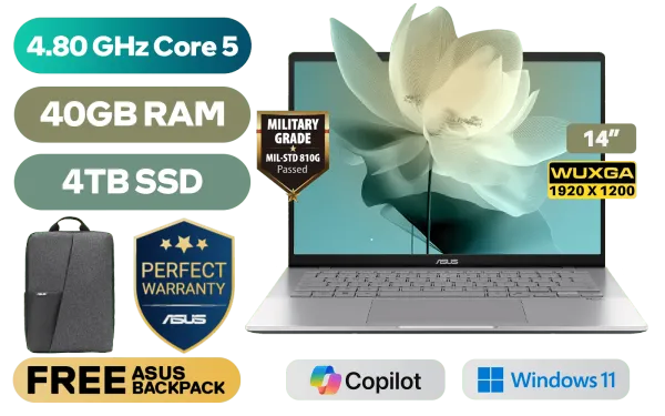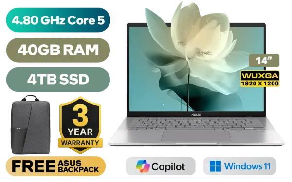 ASUS Vivobook S14 S3407VA Intel® Core™ 5-210H up to 4.80GHz Processor, 12MB Cache, 8x Cores, 12x Threads / 40GB DDR5 RAM / 4TB Ultra-Fast NVMe SSD / 14" WUXGA (1920 x 1200) Anti-Glare IPS-Level Display / Integrated Intel® Graphics / Windows 11 Home (64bit) / Realtek Wi-Fi 6 8852BE Wireless LAN / Bluetooth 5.3 / 1080p FHD IR camera With privacy shutter / 2x USB Type-A / 2x USB Type-C (Supports for Display / Power Delivery) / 1 x HDMI / 1x Microphone and Headphone Combo jack / White Backlit Chicklet Keyboard / 2x 2W Integrated Speakers / FREE Asus Backpack / ASUS Vivobook S14 S3407VA Core 5 Laptop DealASUS Vivobook S14 S3407VA Intel® Core™ 5-210H up to 4.80GHz Processor, 12MB Cache, 8x Cores, 12x Threads / 40GB DDR5 RAM / 4TB Ultra-Fast NVMe SSD / 14" WUXGA (1920 x 1200) Anti-Glare IPS-Level Display / Integrated Intel® Graphics / Windows 11 Home (64bit) / Realtek Wi-Fi 6 8852BE Wireless LAN / Bluetooth 5.3 / 1080p FHD IR camera With privacy shutter / 2x USB Type-A / 2x USB Type-C (Supports for Display / Power Delivery) / 1 x HDMI / 1x Microphone and Headphone Combo jack / White Backlit Chicklet Keyboard / 2x 2W Integrated Speakers / FREE Asus Backpack / ASUS Vivobook S14 S3407VA Core 5 Laptop Deal [S3407VA-I516512S1W/40GB/4TB] / 3 YEARS WARRANTY / [+] GET FREE Logitech M185 Wireless Mouse+ FREE DELIVERY !